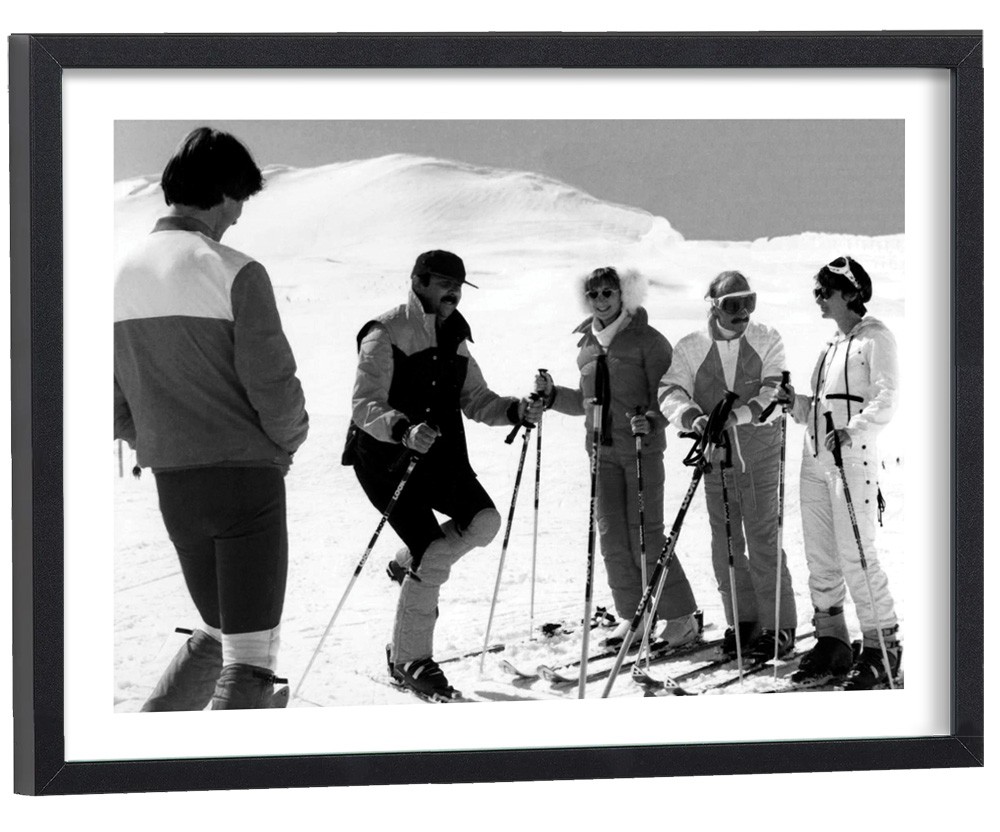 L'affiche présente une scène emblématique de la comédie française mythique, capturée dans un magnifique noir et blanc intemporel. La photographie dévoile les personnages iconiques sur les pistes enneigées, équipés de leurs skis et bâtons, dans une composition dynamique qui évoque parfaitement l'ambiance décontractée et humoristique du film. Les contrastes subtils entre la neige immaculée et les silhouettes des acteurs créent une esthétique vintage particulièrement séduisante.