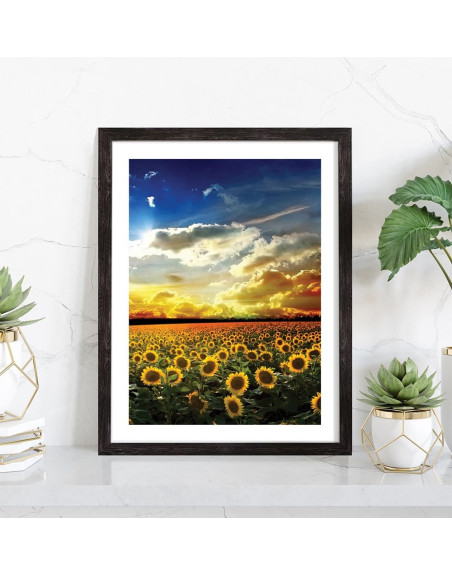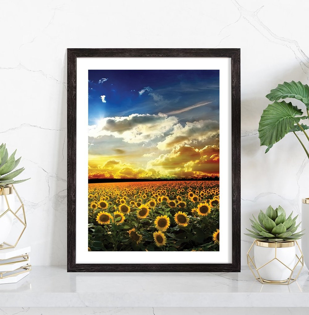 Tableau décoration nature d'un champ de tournesols sous le soleil et les nuages.