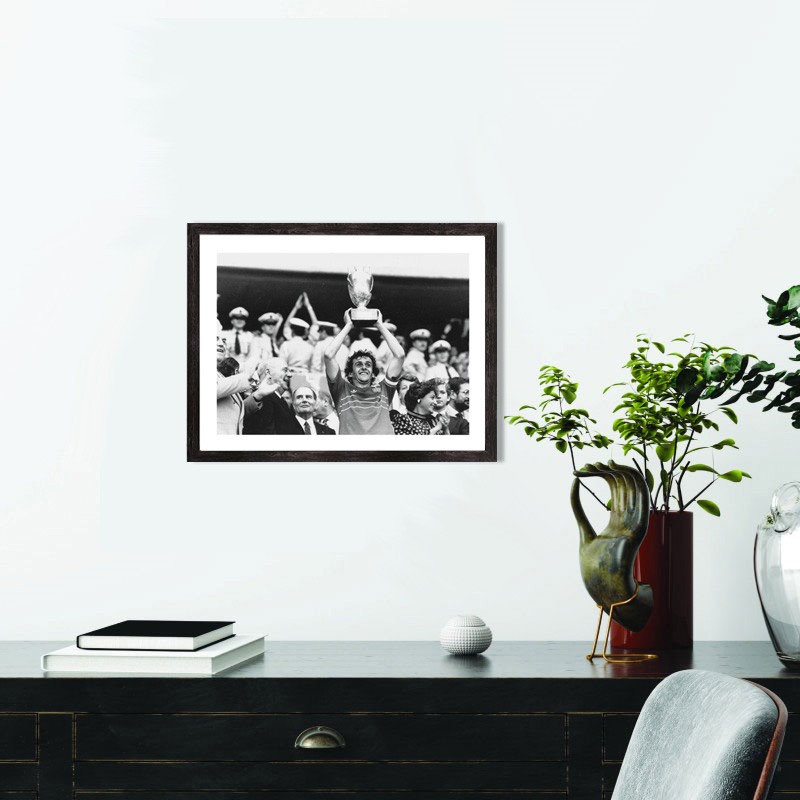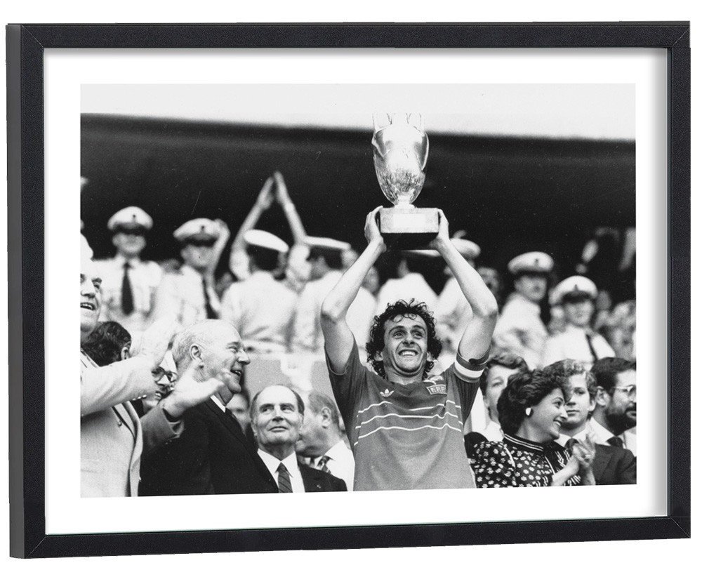 Revivez le triomphe historique de l'équipe de France de football lors de l'Euro 1984. Affiche noir et blanc de Michel Platini brandissant le trophée.