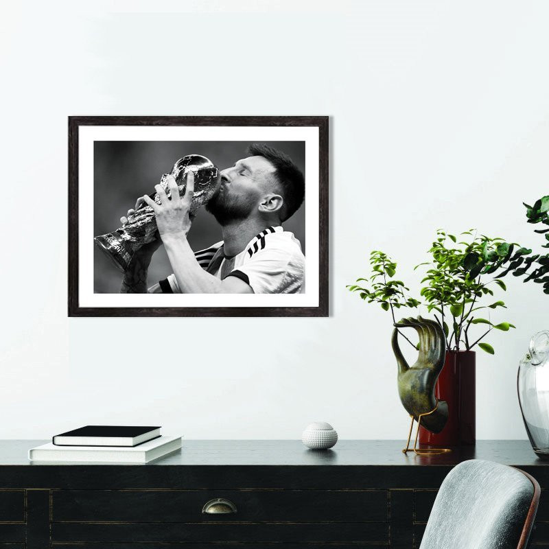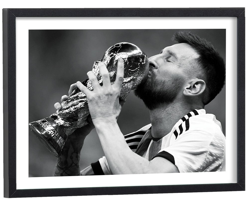 Voici une affiche légendaire qui restera dans l'histoire. Retrouvez la photo de Lionel Messi en train d'embrasser la coupe du monde après la finale de la coupe du monde de football 2022. A l'issue d'une finale majestueuse face à l'équipe de France qui est parvenue à arracher les prolongations en égalisant en toute fin de match (3-3), l'Argentine a marqué lors des prolongations avant de se faire rejoindre par les bleus (4-4). Cette finale de coupe du monde s'est donc terminée aux tirs aux buts. Lionel Messi, auteur d'un match exceptionnel, est enfin parvenu à remporter le seul trophée qu'il manquait à son palmarès, la coupe du monde.
