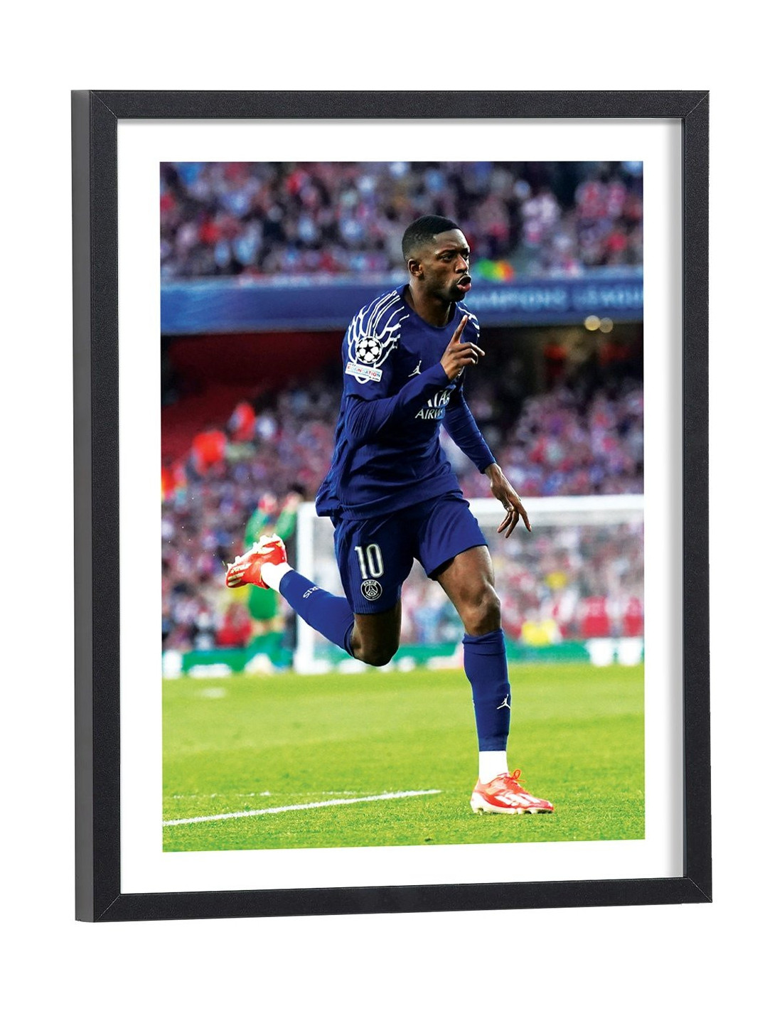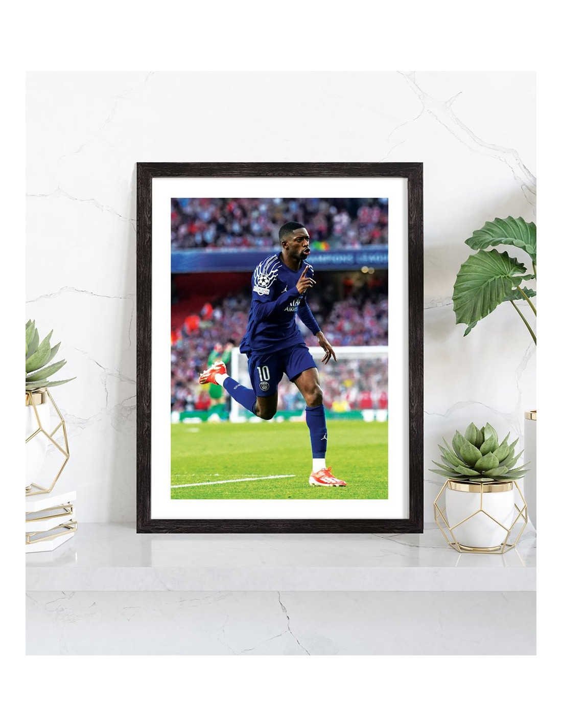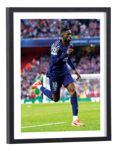 Tableau décoration vintage d'Ousmane Dembélé célébrant un but lors d'un match de football avec le Paris Saint Germain en 2025.