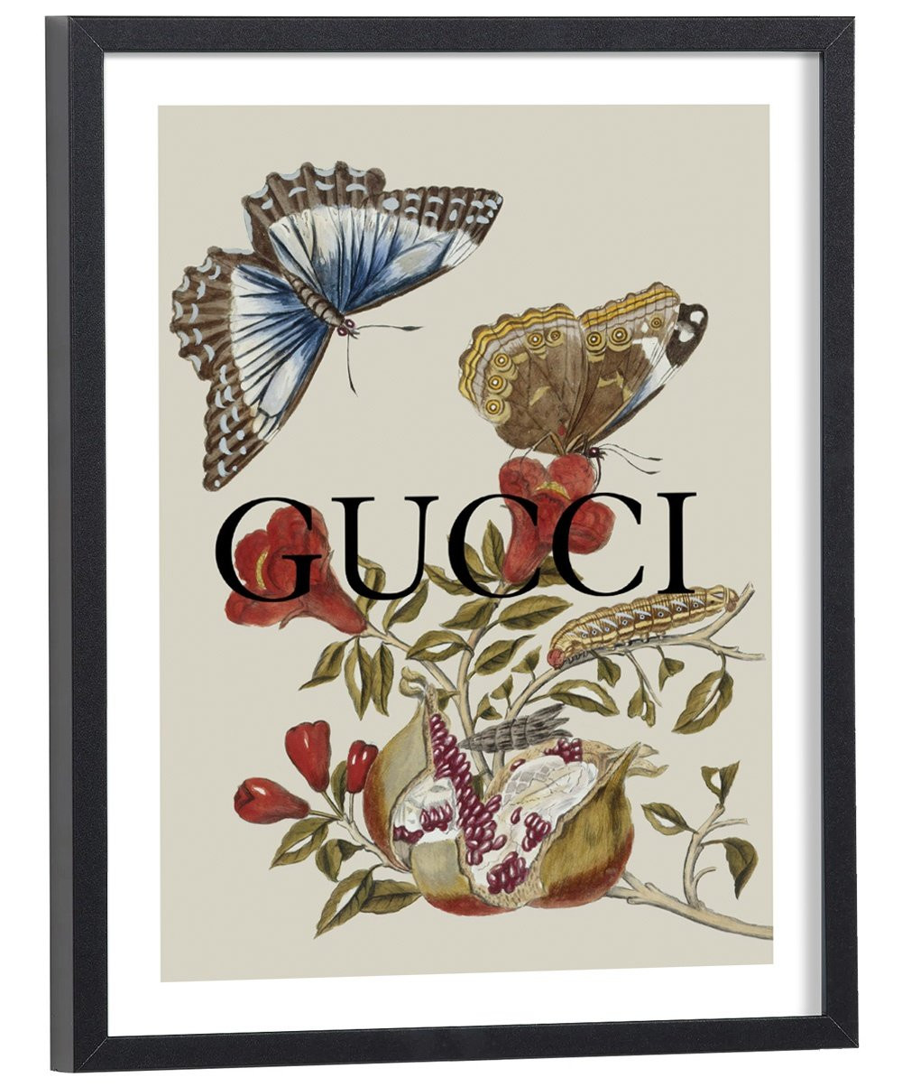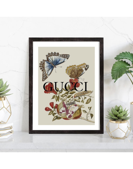 Tableau décoration mode Gucci coloré avec des papillons artistiques.