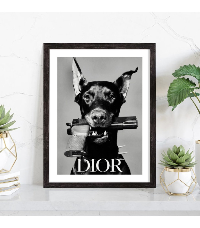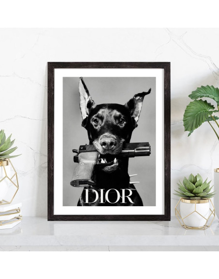Tableau décoration mode Dior avec un chien tenant dans sa gueule un revolver.