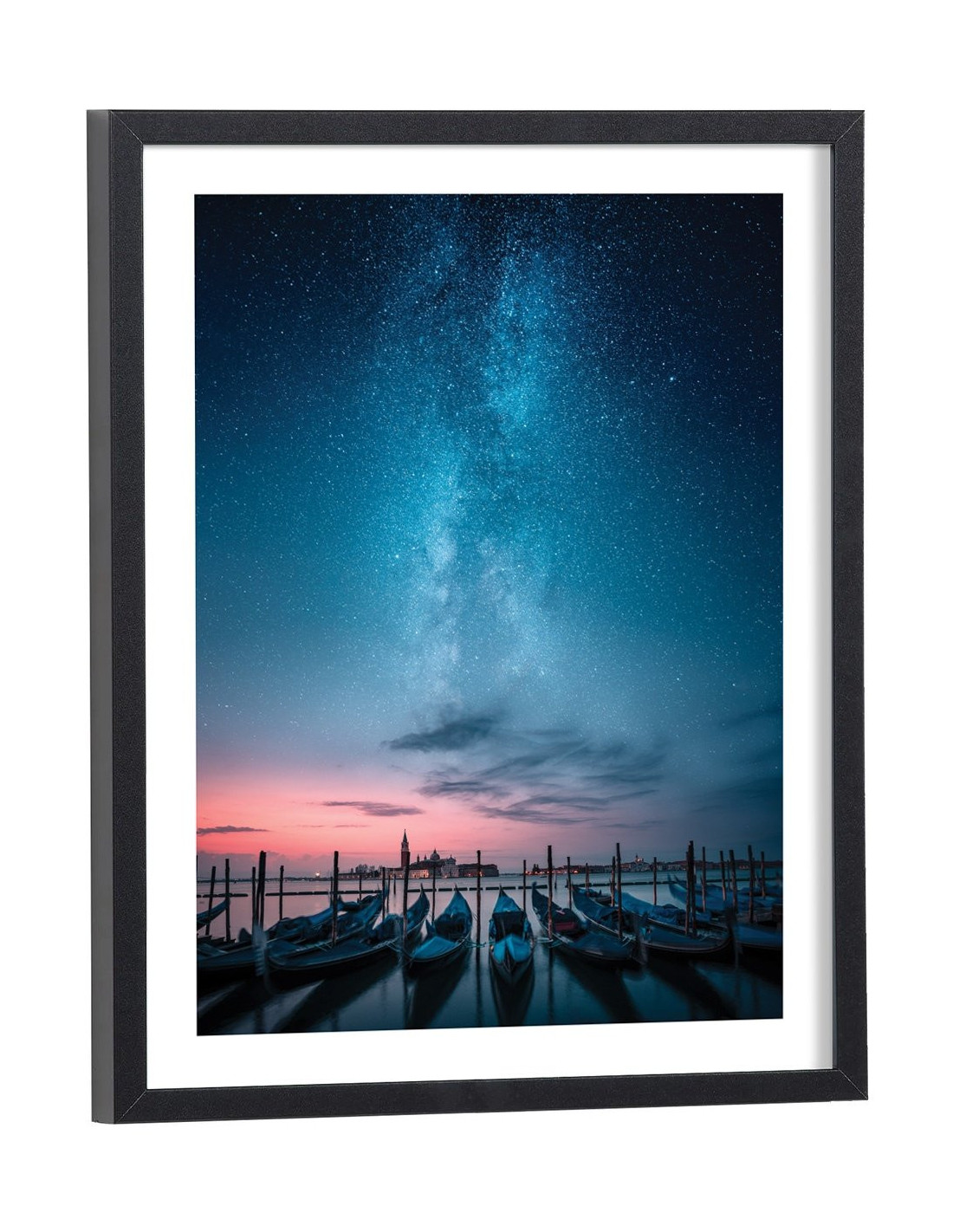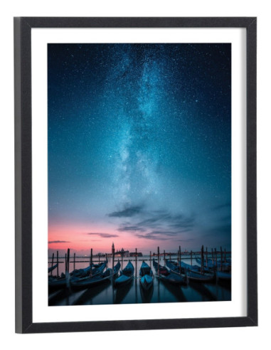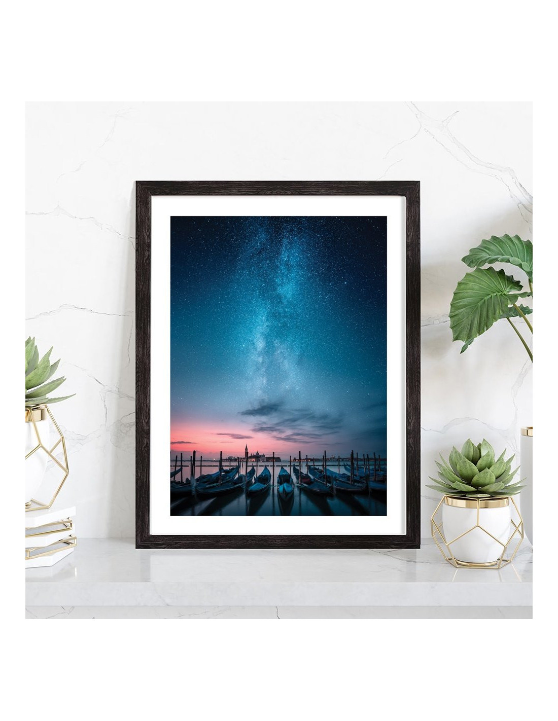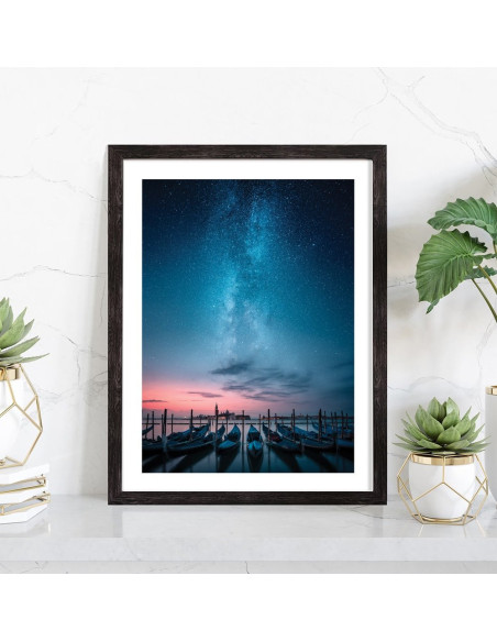 Tableau décoration nature d'un paysage de ciel étoilé et barques.