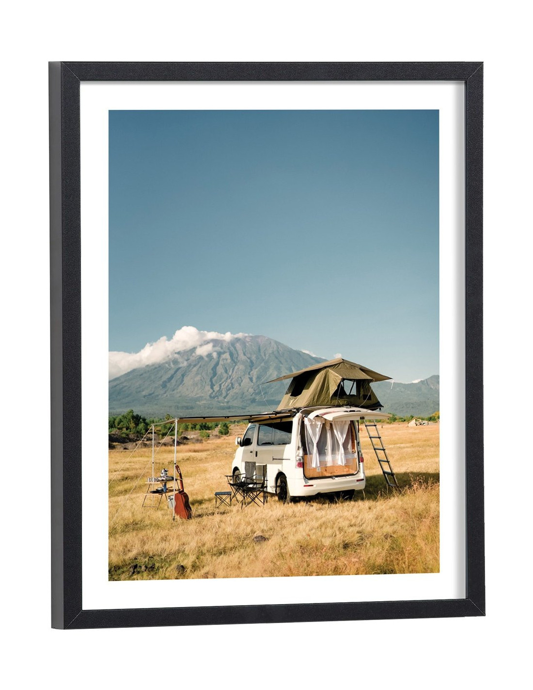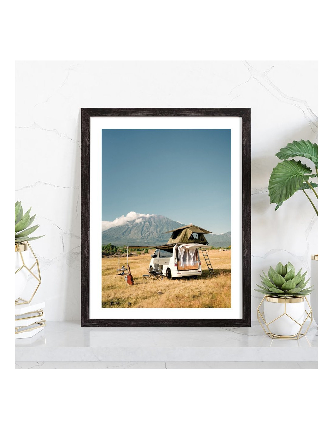 Tableau décoration d'un van avec une tante de toit dans la nature face à une montagne.