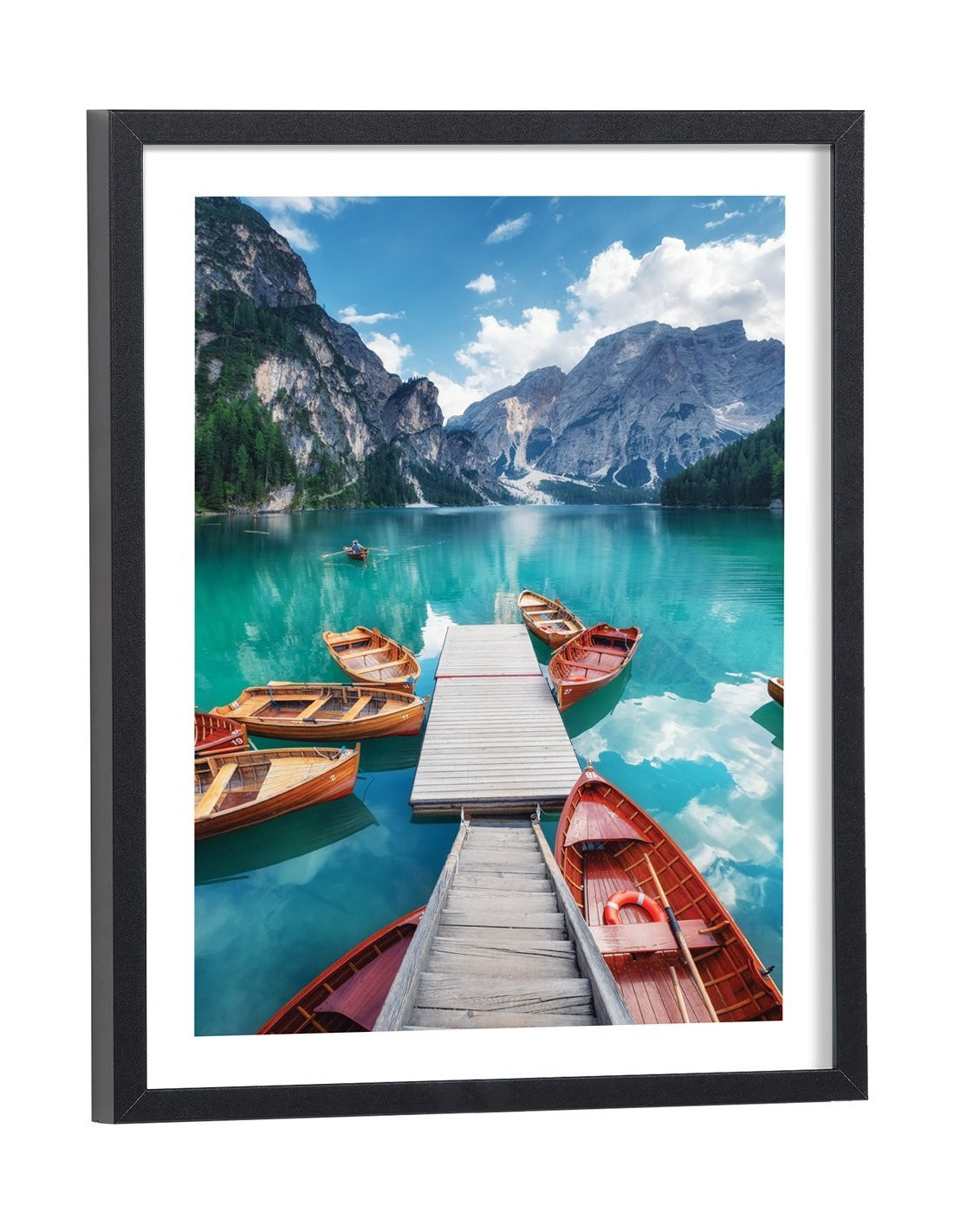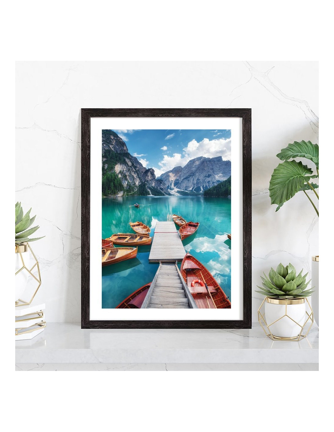 Tableau décoration nature de barques sur l'eau dans un paysage de montagne.