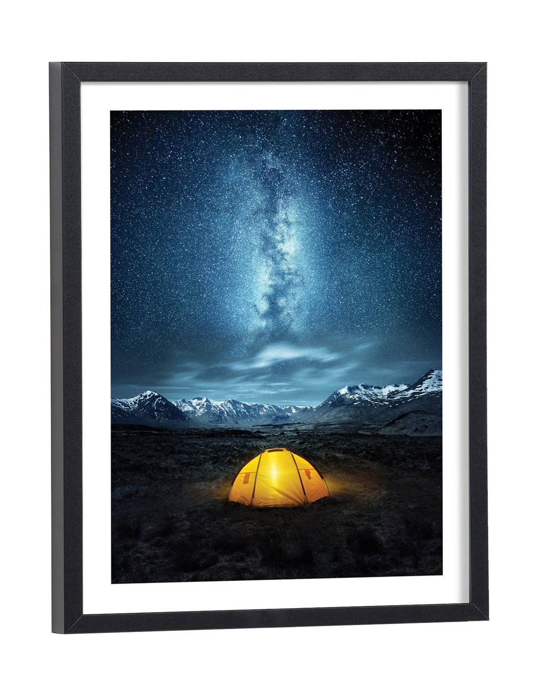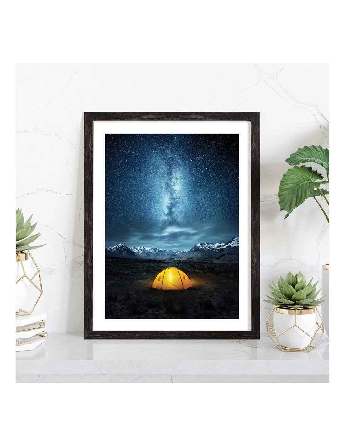 Tableau décoration nature d'un campeur dormant sous le ciel étoilé en montagne.