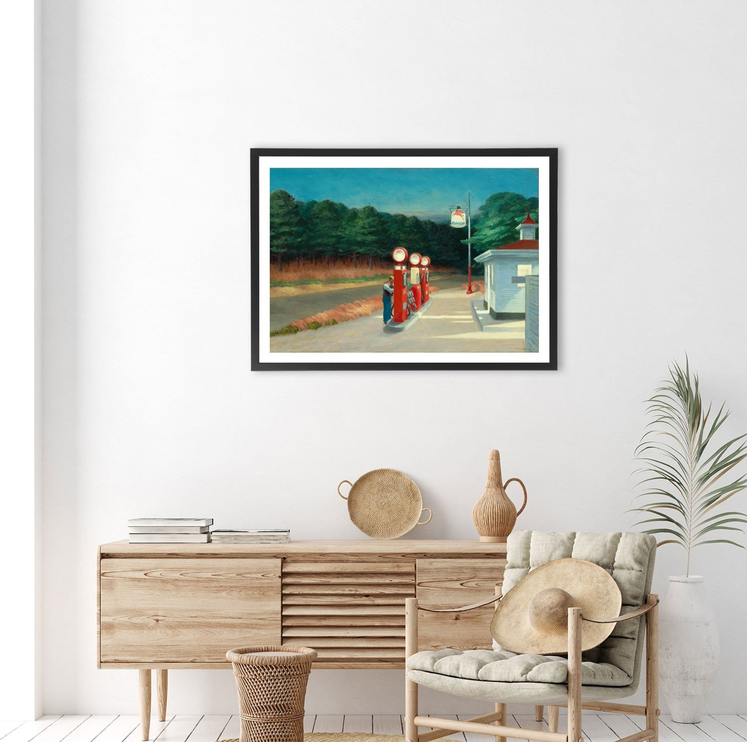 Tableau décoration d'une reproduction de l'oeuvre "Gas", une peinture de 1940 du peintre américain Edward Hopper. Il représente une station-service américaine au bout d'une autoroute.
