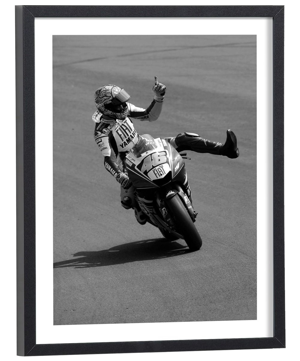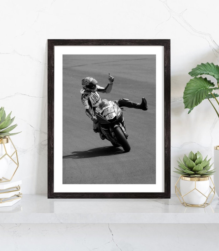 Affiche noir et blanc de Valentino Rossi, pilote de vitesse moto, sacré neuf fois champion du monde en Grand Prix Moto.