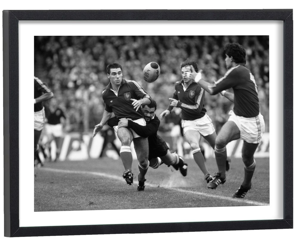 Affiche du match de rugby France-All Blacks de 1986. Photo noir et blanc vintage parfaite pour les passionnés de sport.
