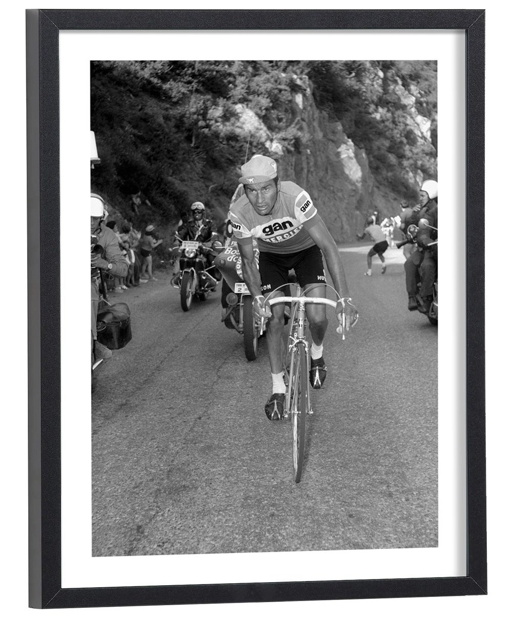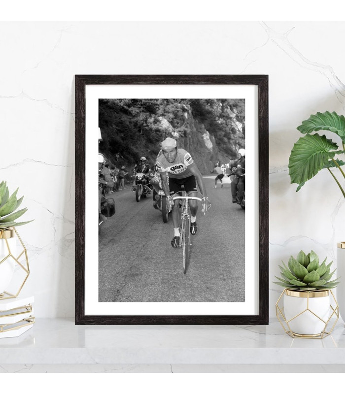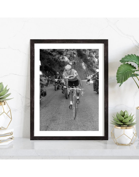 Tableau décoration noir et blanc du coureur cycliste Raymond Poulidor avec son vélo lors du tour de France.