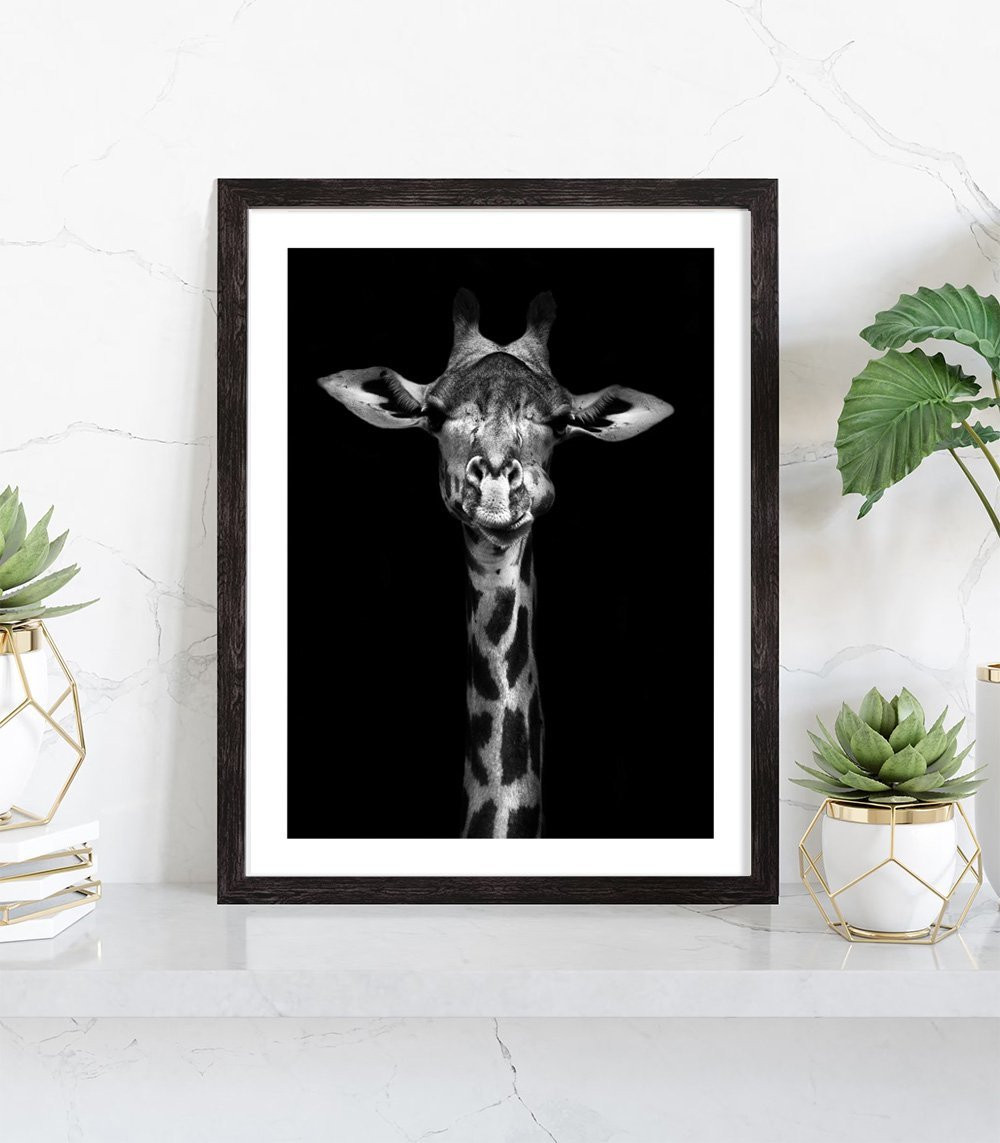 Tableau décoration noir et blanc de girafe. Cette affiche composé d'un cadre et d'une affiche noir et blanc de girafe décorera parfaitement votre intérieur.
