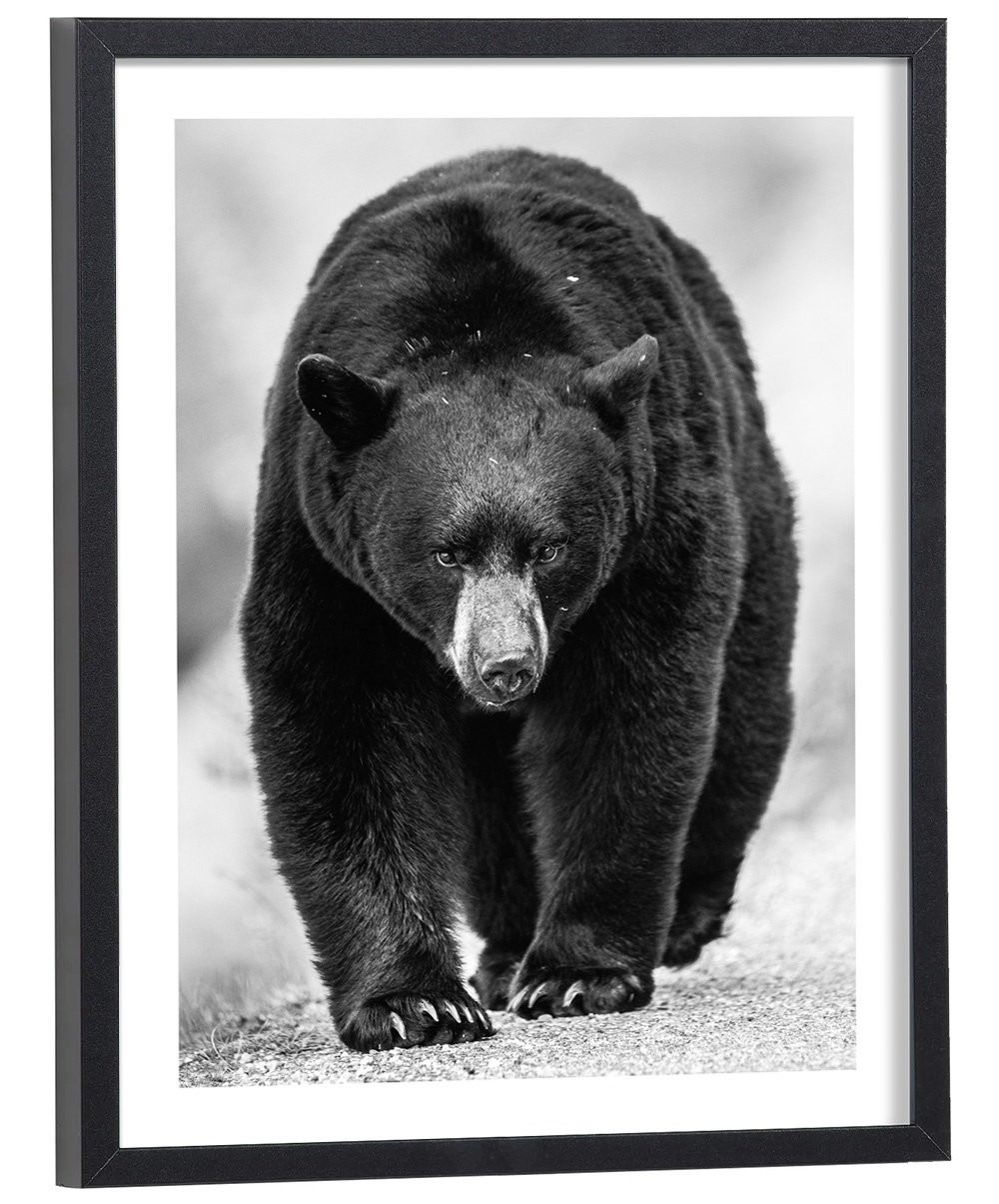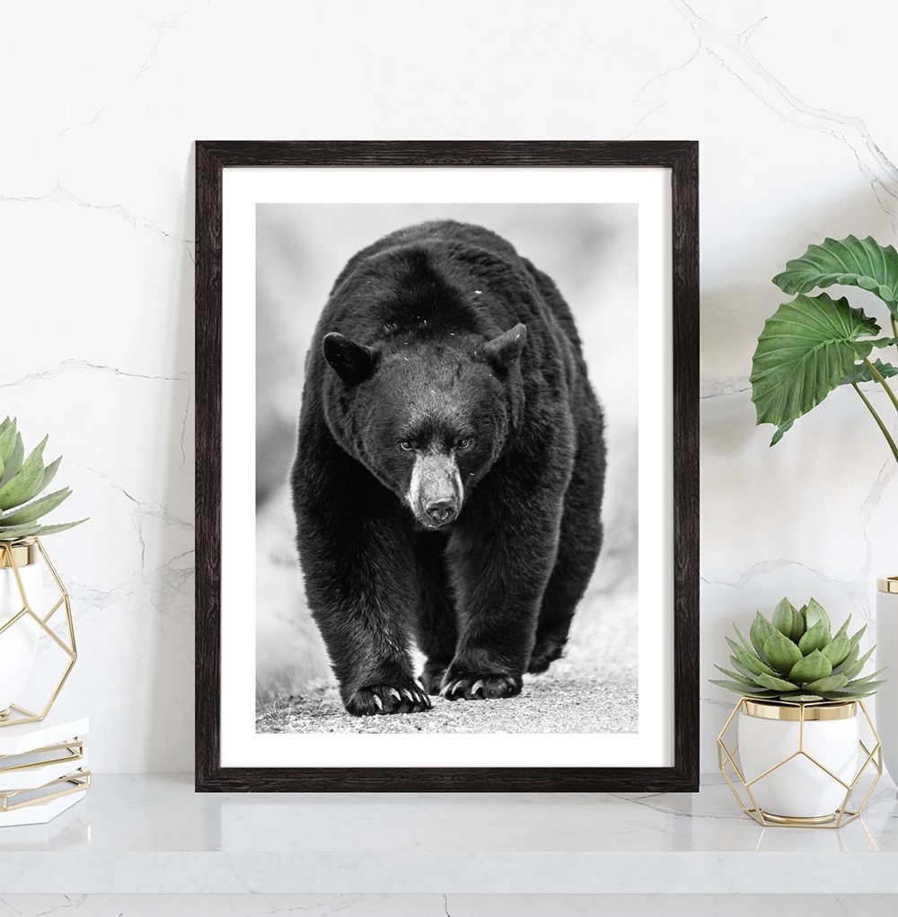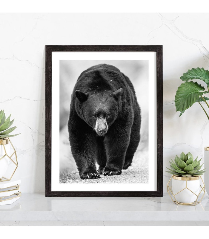 Tableau décoration noir et blanc d'un ours brun. Cette affiche encadrée décorera parfaitement votre intérieur.