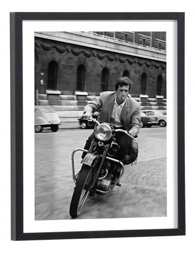 Affiche vintage noir et blanc de Jean Paul Belmondo en moto et fumant un cigare.