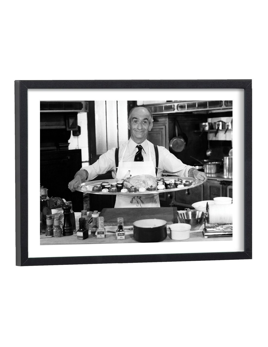 Affiche noir et blanc de Louis De Funès dans une scène du film culte "L'aile ou la cuisse".