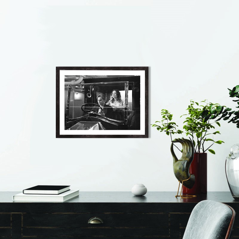 L'affiche capture l'une des scènes les plus iconiques du cinéma avec Jack et Rose dans la luxueuse automobile du paquebot. Le noir et blanc intensifie l'émotion de ce moment intime, où les regards complices des deux personnages traduisent toute la passion de leur histoire d'amour impossible. Les reflets sur la carrosserie et l'élégance Art déco de la voiture d'époque créent une atmosphère sophistiquée et romantique.