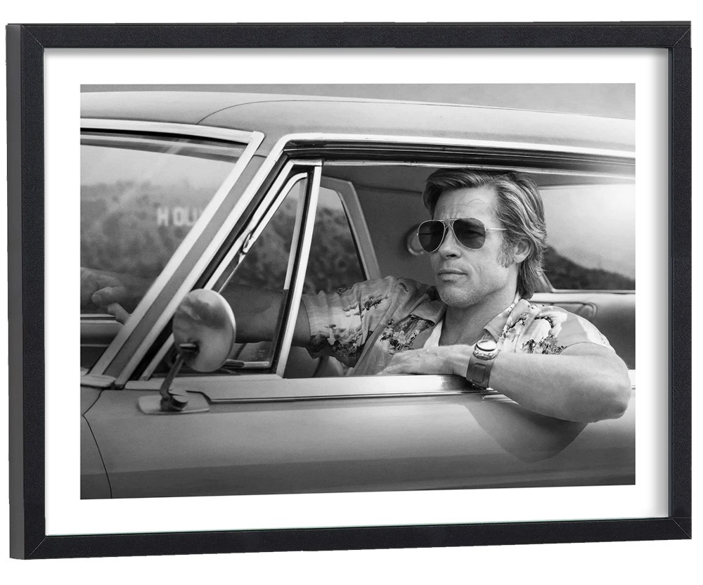 L'affiche d'Once Upon A Time In Hollywood capture l'essence du Hollywood vintage avec Brad Pitt au volant, lunettes aviateur et chemise à fleurs, dans un superbe noir et blanc cinématographique. L'image évoque parfaitement l'ambiance des années 60-70, avec ses lignes automobiles classiques et son esthétique rétro-glamour caractéristique du style Tarantino.
