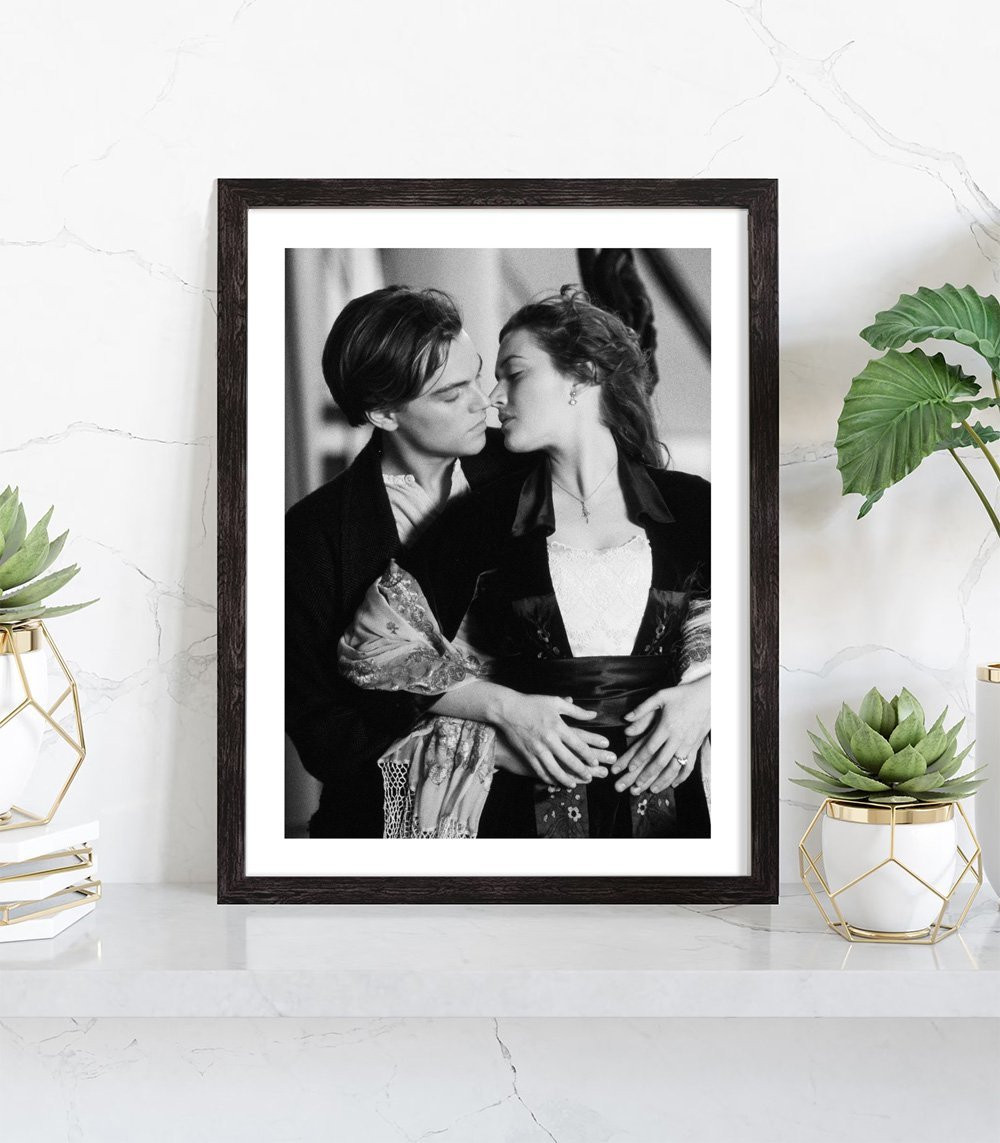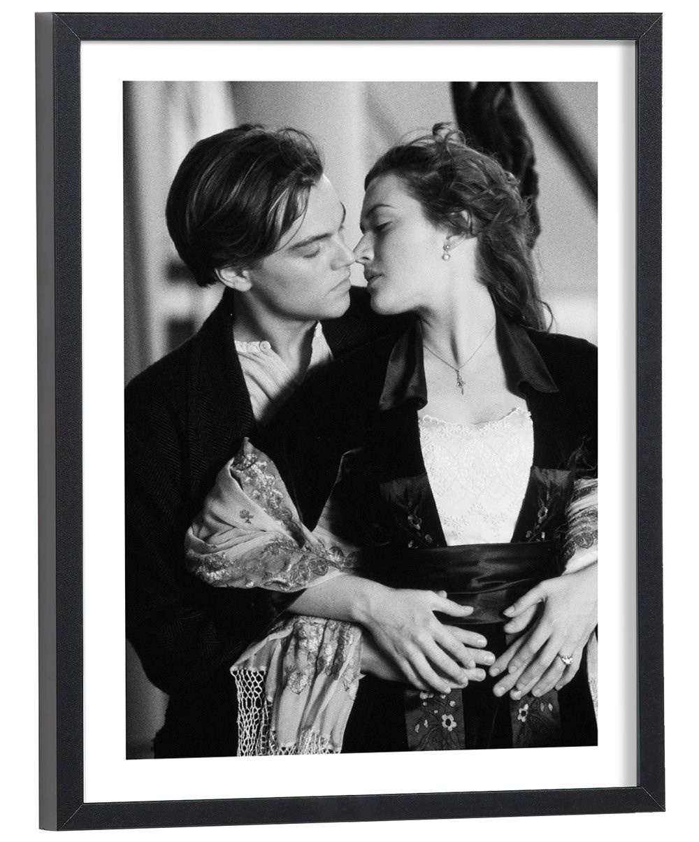 Tableau décoration cinéma noir et blanc d'une scène du film Titanic avec Leonardo DiCaprio et Kate Winslet.