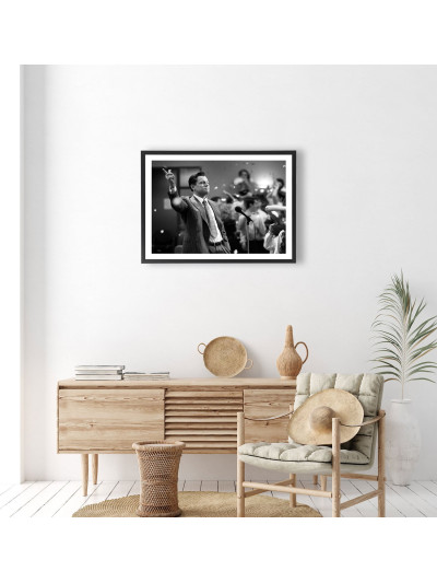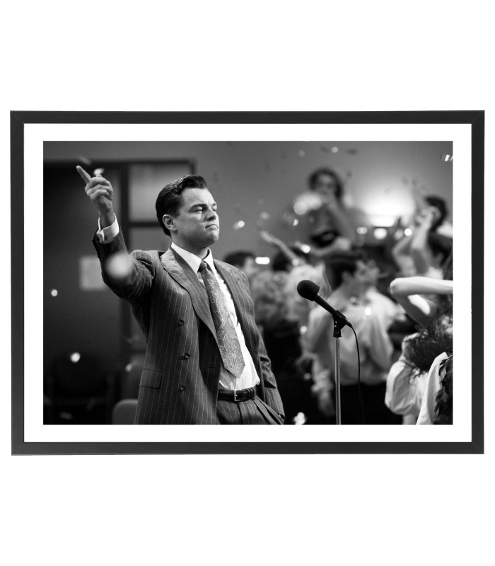 Tableau décoration noir et blanc d'une scène du film "Le loup de Wall Street" avec Leonardo DiCaprio.