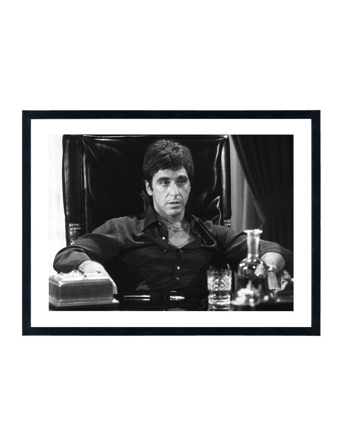 Affiche tirée d'une scène du film Scarface, sorti au cinéma en 1983. Dans ce film, Tony Montana (Al Pacino) retourne aux Etats-Unis et élabore un plan pour régner le marché de la drogue. Sur cette affiche, on peut voir Tony Montana assis derrière son bureau. Cette photo est culte et est souvent représentée sur les affiches et les posters qui représentent le film Scarface.