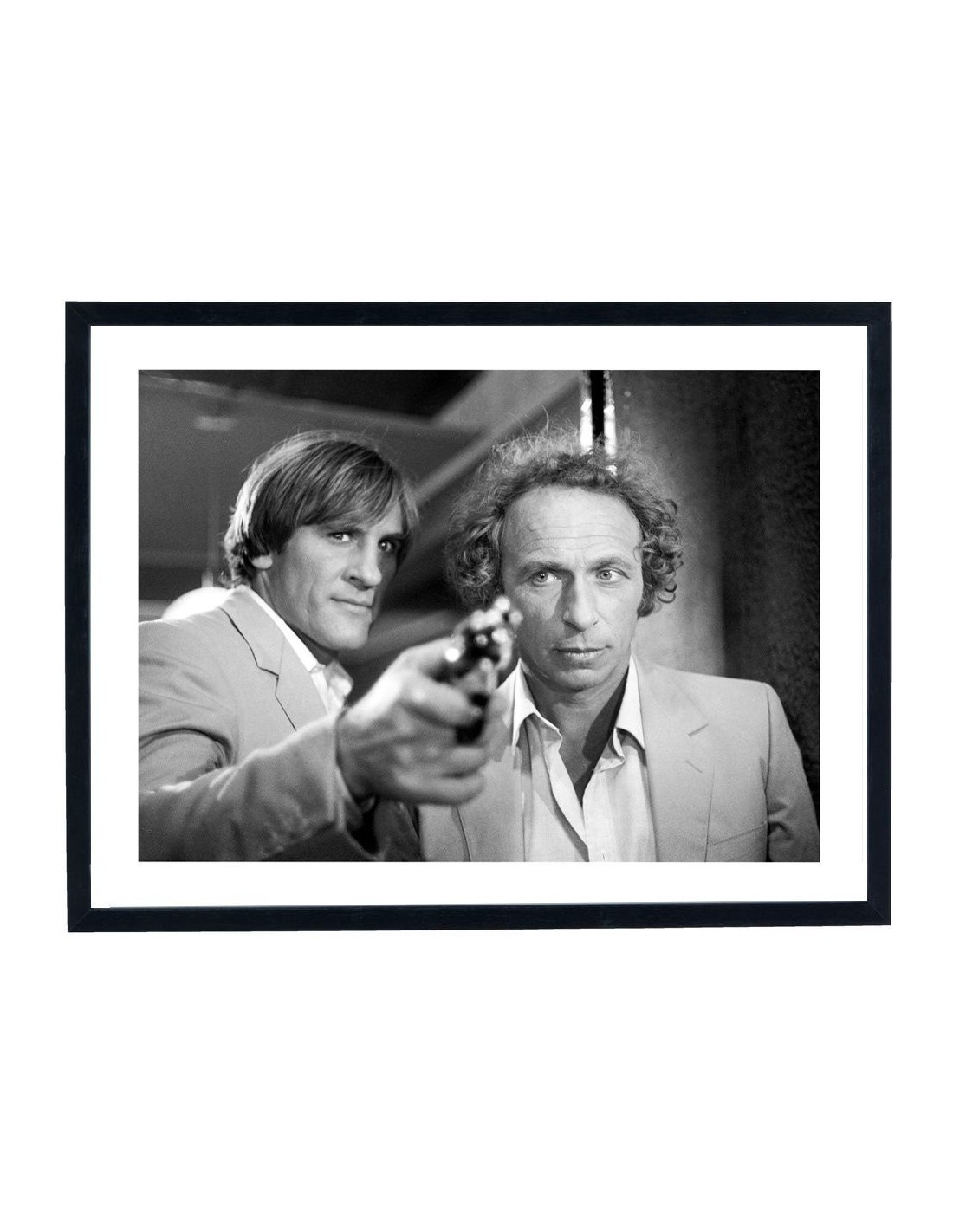 Tableau décoration vintage noir et blanc de Gerard Depardieu et Pierre Richard lors d'une scène dans le film "La chèvre".