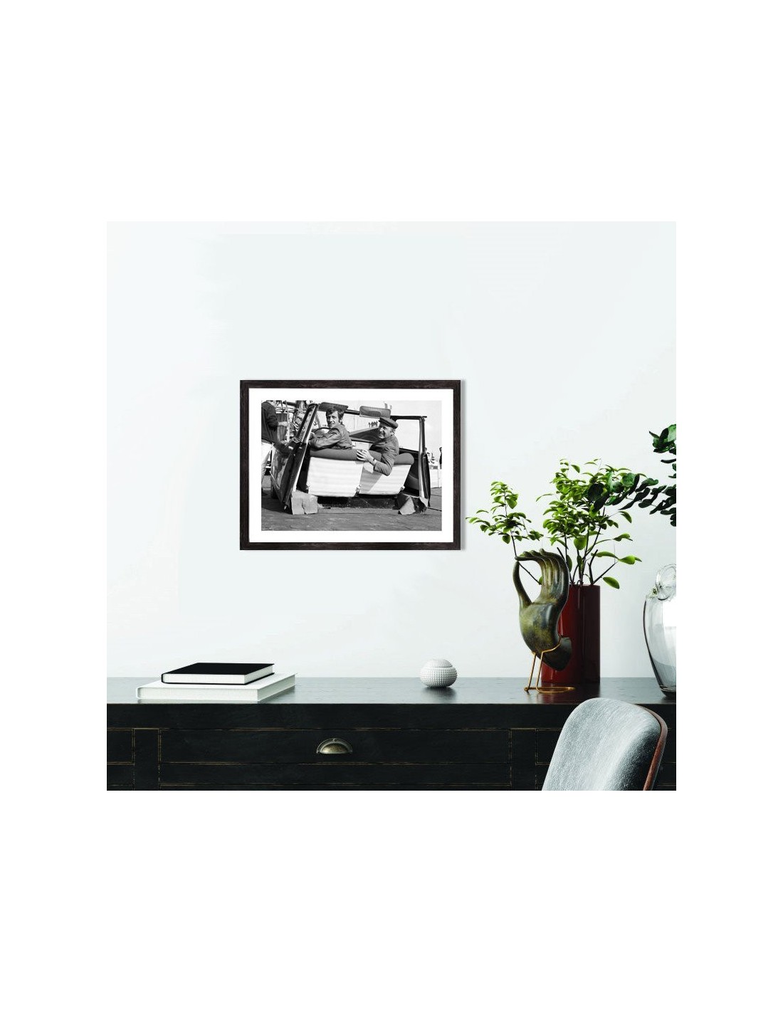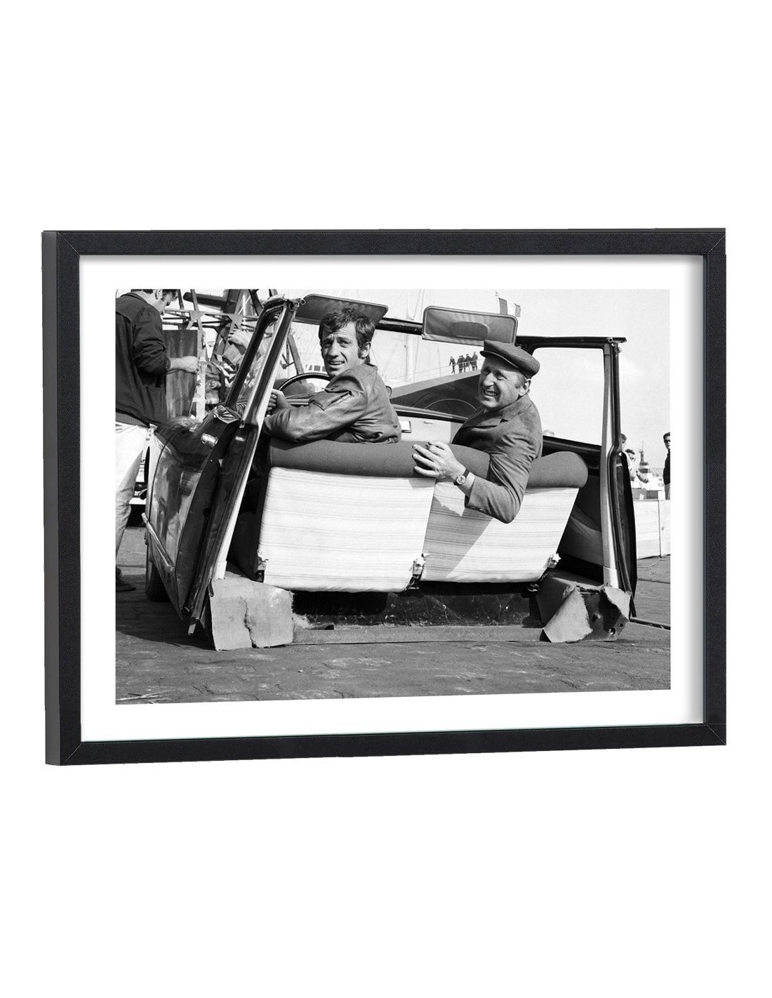 Tableau noir et blanc de Bourvil et Jean Paul Belmondo dans une citroën DS coupée en deux lors du tournage du film "Le Cerveau" réalisé par Gérard Oury et sorti au cinema en 1969.