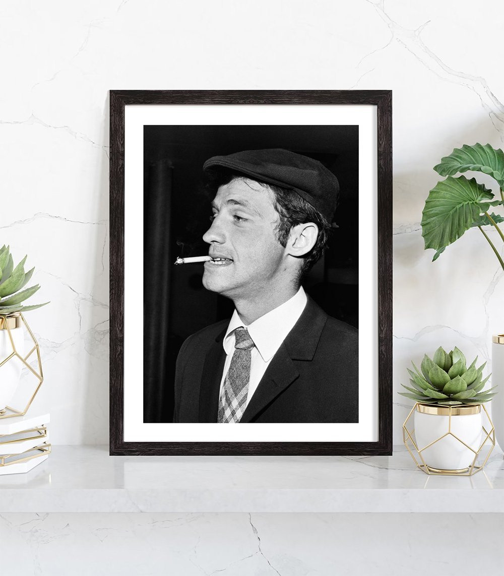 Tableau vintage noir et blanc de Jean Paul Belmondo lors du film « A bout de souffle » de Jean-Luc Godard en 1960.