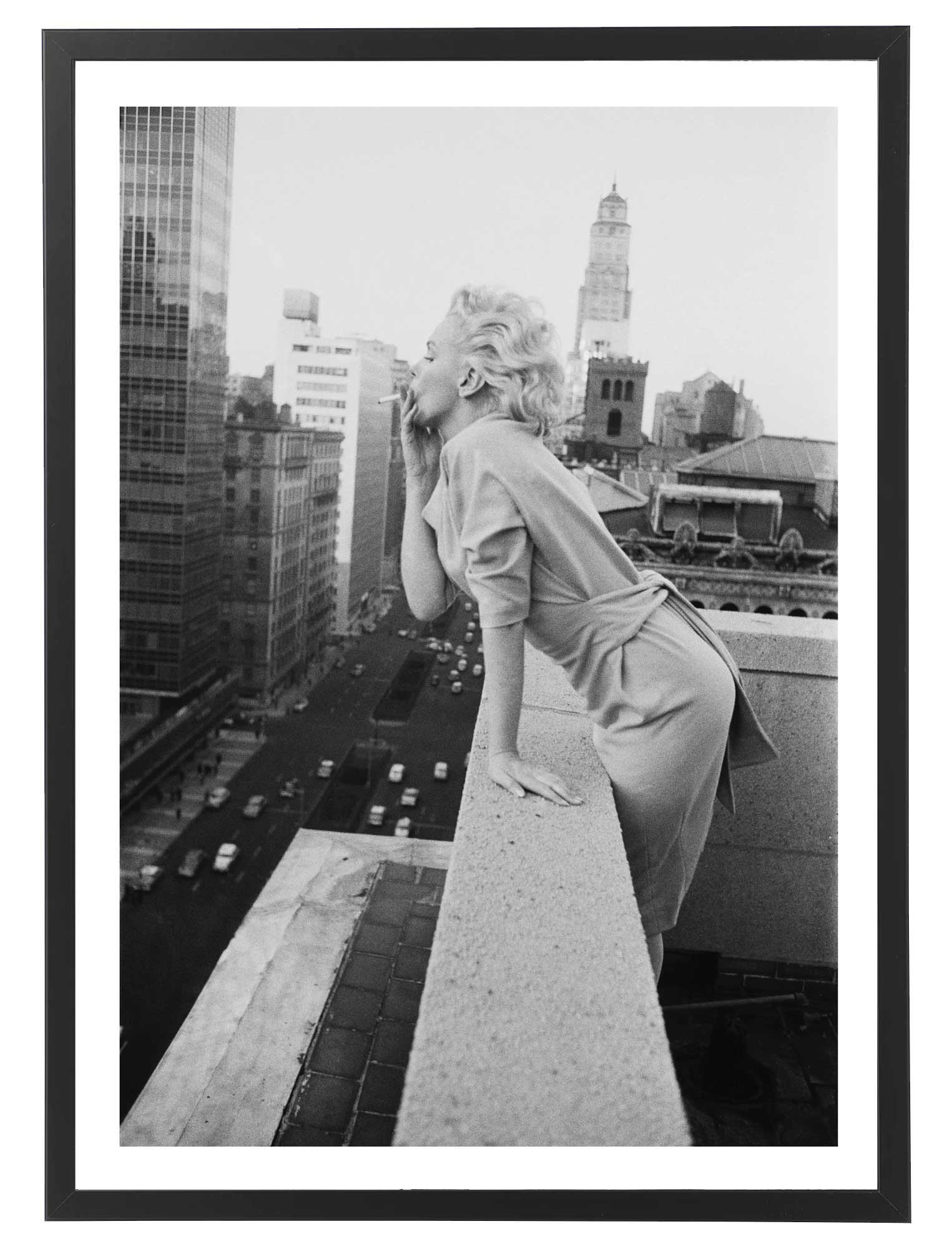 Tableau Marilyn Monroe noir et blanc, fumant une cigarette sur un balcon de New York en 1955.