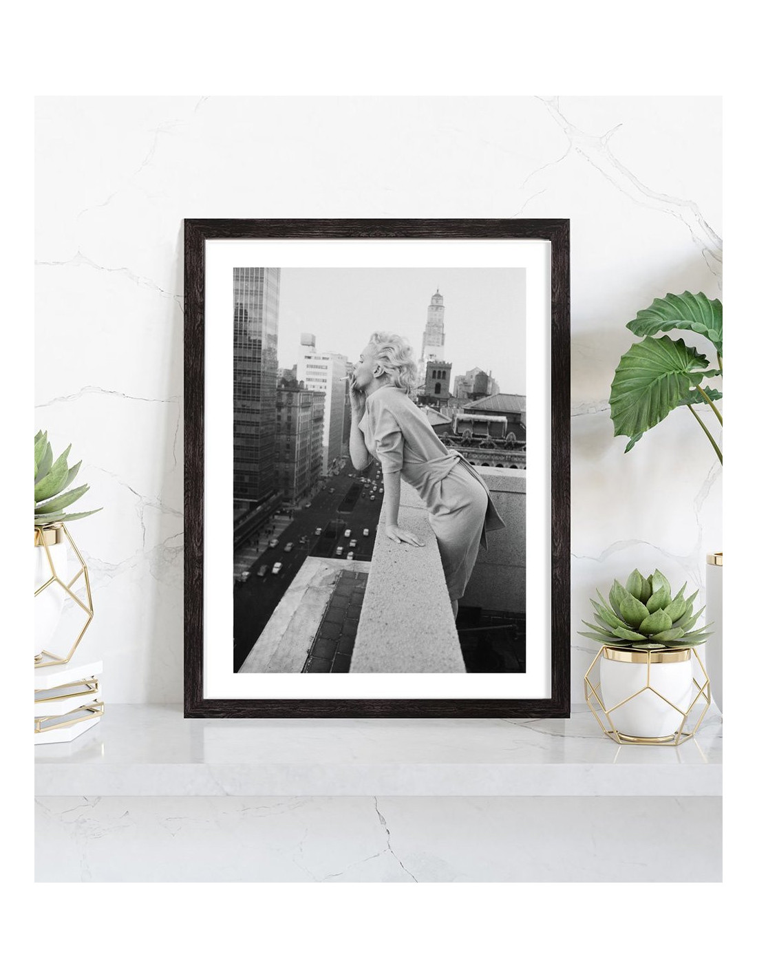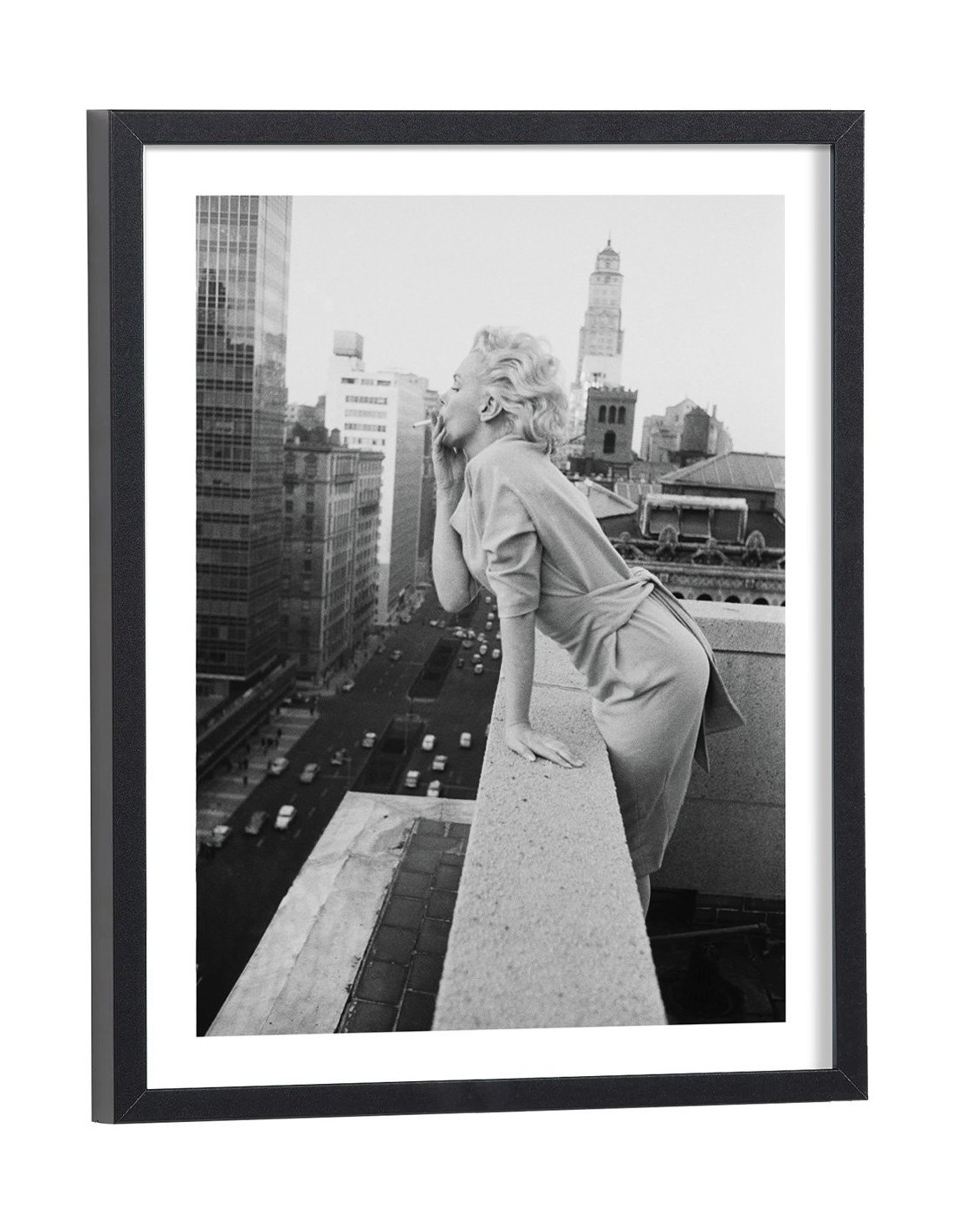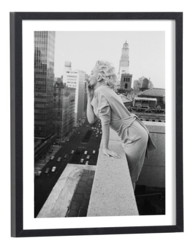 Nous vous proposons un tableau de Marilyn Monroe sur lequel on aperçoit l'artiste américaine qui fume une cigarette sur un balcon de New York en 1955. Marilyn Monroe est née à Los Angeles en 1926 et morte en 1962 dans la même ville. Cette artiste aux multiples talents était actrice, mannequin et chanteuse. Véritable icône des années 50, elle sera représenté à de nombreuses reprises sur des tableaux, affiches et posters. Ce tableau de Marilyn Monroe noir et blanc conviendra parfaitement pour une décoration d'intérieur vintage.