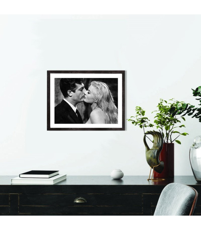 Affiche décoration noir et blanc d'une scène du film "La Dolce Vita" avec Marcello Mastroianni et Anita Ekberg. Affiche encadrée avec cadre en bois noir.