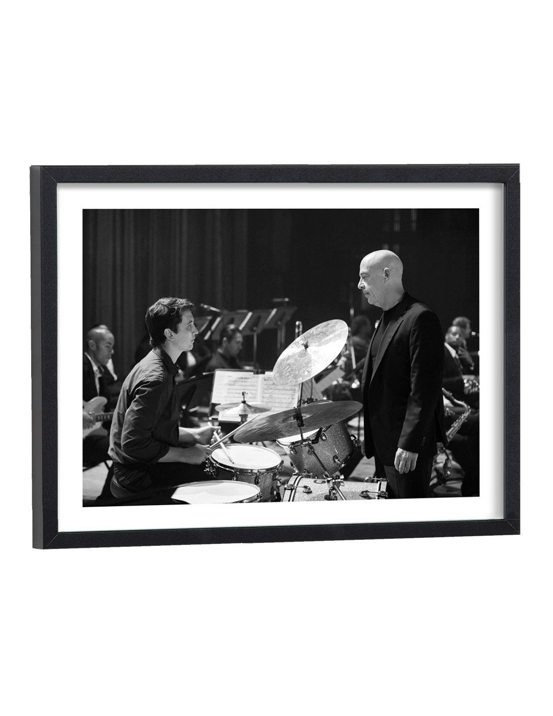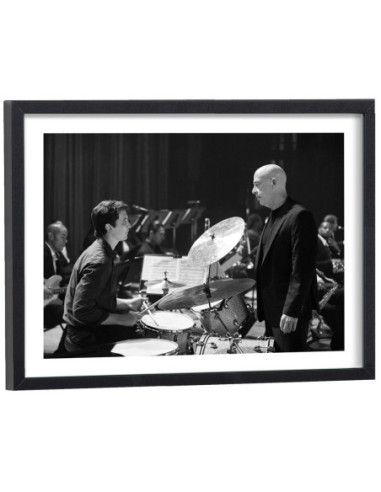 Affiche décoration d'une scène du film "Whiplash" sorti en 2014. Affiche encadrée avec cadre en bois noir.