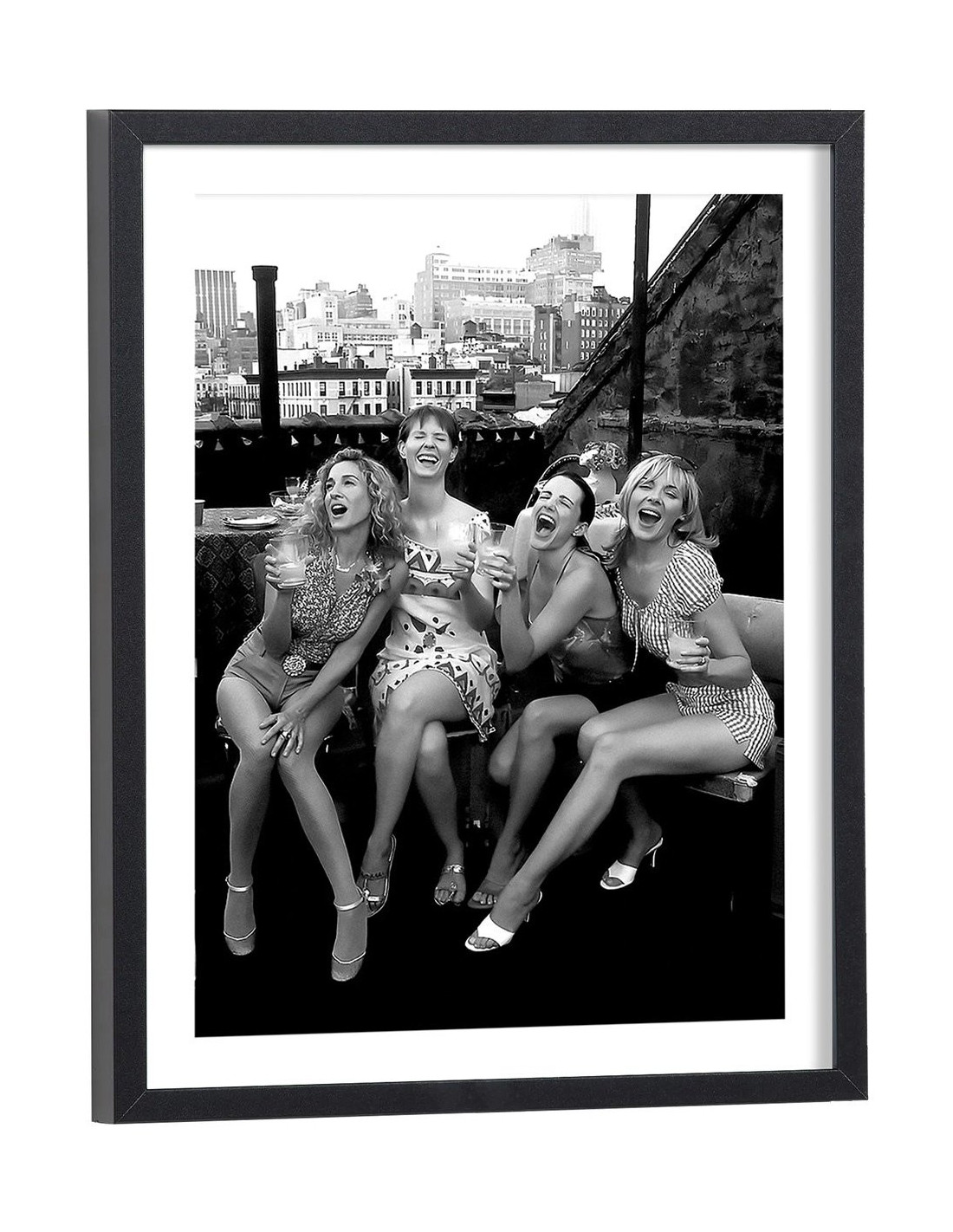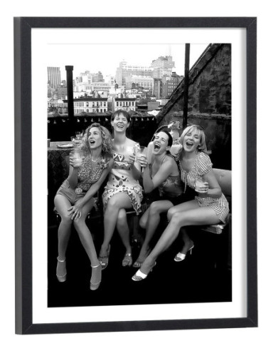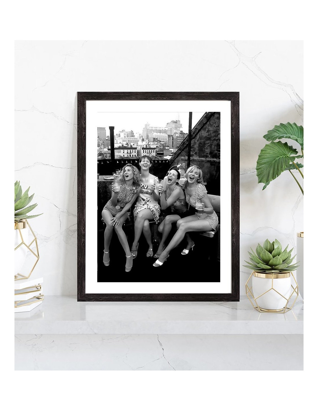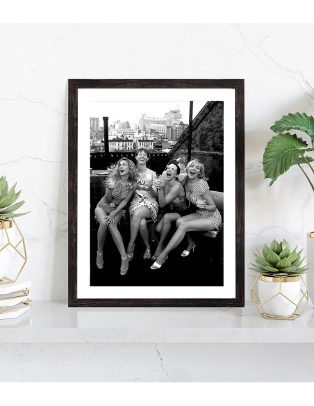 Affiche décoration noir et blanc d'une scène de la série "Sex and the City" avec Sarah Jessica Parker (Carrie Bradshaw), Kim Cattrall (Samantha Jones), Cynthia Nixon (Miranda Hobbes) et Kristin Davis (Charlotte York). Affiche encadrée avec cadre en bois noir.