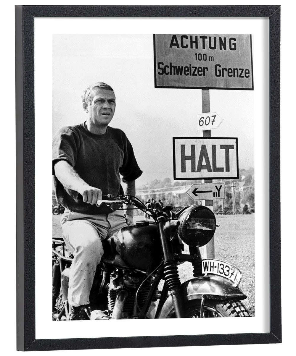 Tableau décoration vintage noir et blanc de Steve McQueen sur une moto Triumph dans le film "La grande évasion" (1963).