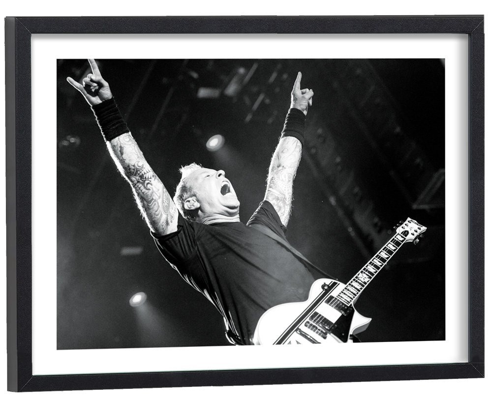 Tableau décoration noir et blanc du chanteur du groupe Metallica, James Hetfield, lors d'un concert.