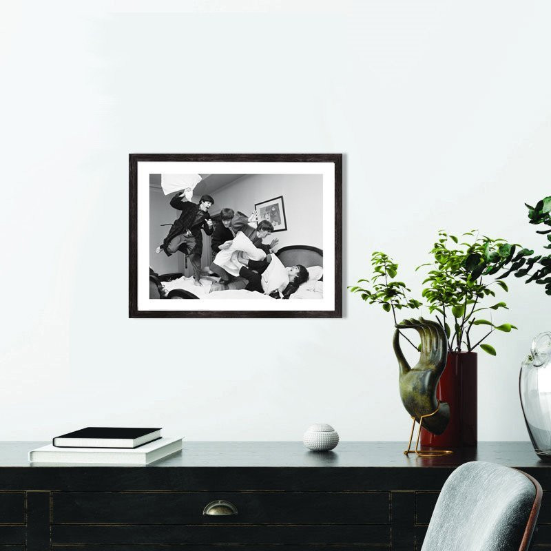 Tableau noir et blanc des Beatles lors d'une bataille de polochons à l'hôtel Georges V de Paris en 1964.