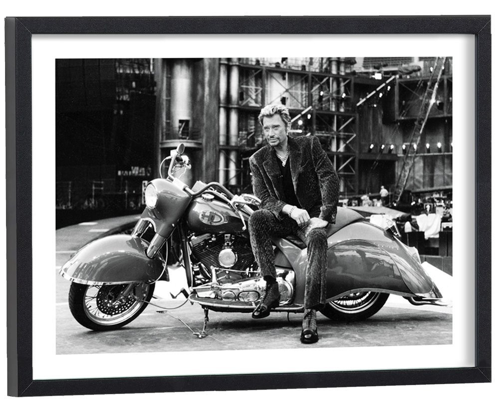 Nous proposons de nombreux tableaux et affiches dans le domaine de la musique. Parmi les tableaux de musiciens les plus recherchées, le tableau Johnny Hallyday est l'un des plus convoités. Ce tableau en noir et blanc de Johnny Hallyday sur sa moto sera parfait pour les fans du plus célèbre des chanteurs français.