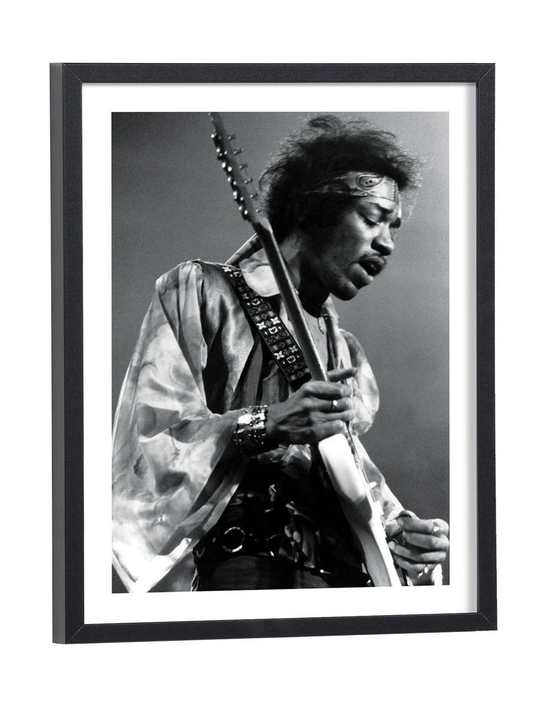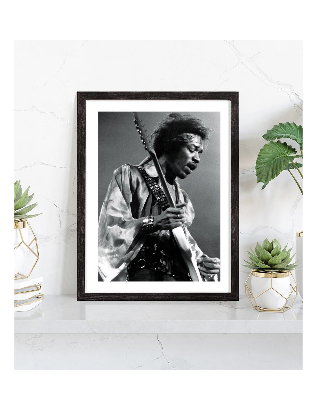 Tableau décoration vintage de Jimi Hendrix avec sa guitare en main lors d'un concert.