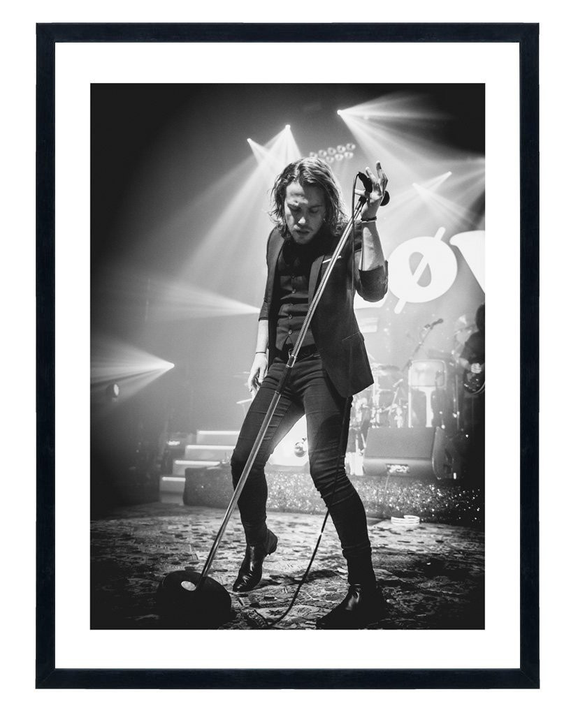 Tableau de décoration vintage noir et blanc de Julien Doré sur scène lors d'un concert.