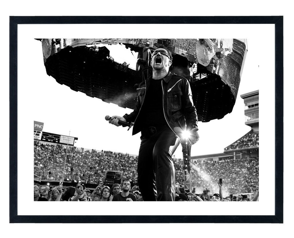 Tableau décoration vintage noir et blanc de Bono, chanteur du groupe U2, lors d'un concert du groupe.