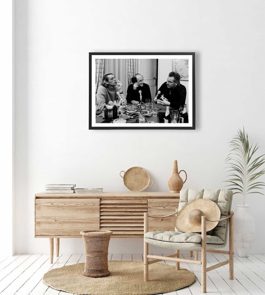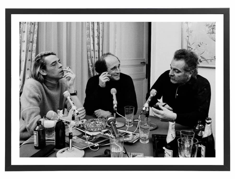 Tableau décoration vintage "Trois Hommes sur la photo". Les chanteurs Brel, Brassens et Ferré en 1969.