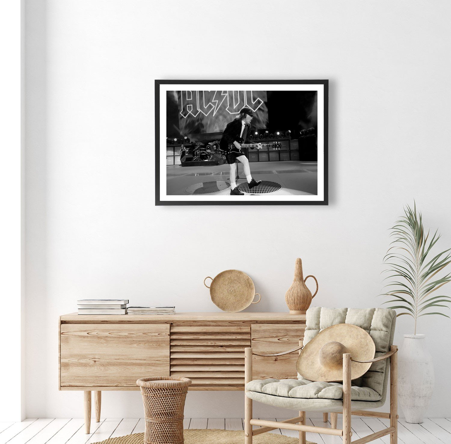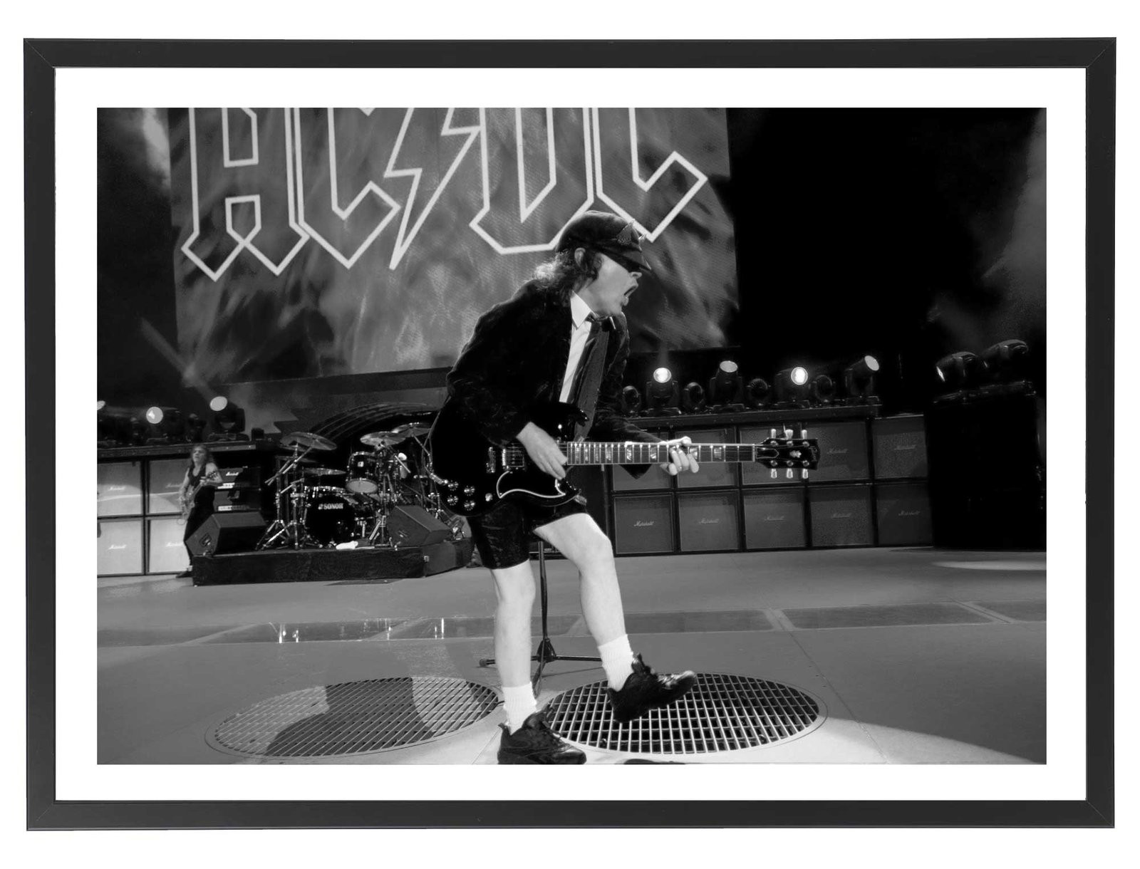 Tableau décoration noir et blanc d'un concert du groupe AC DC avec Angus Young à la guitare.