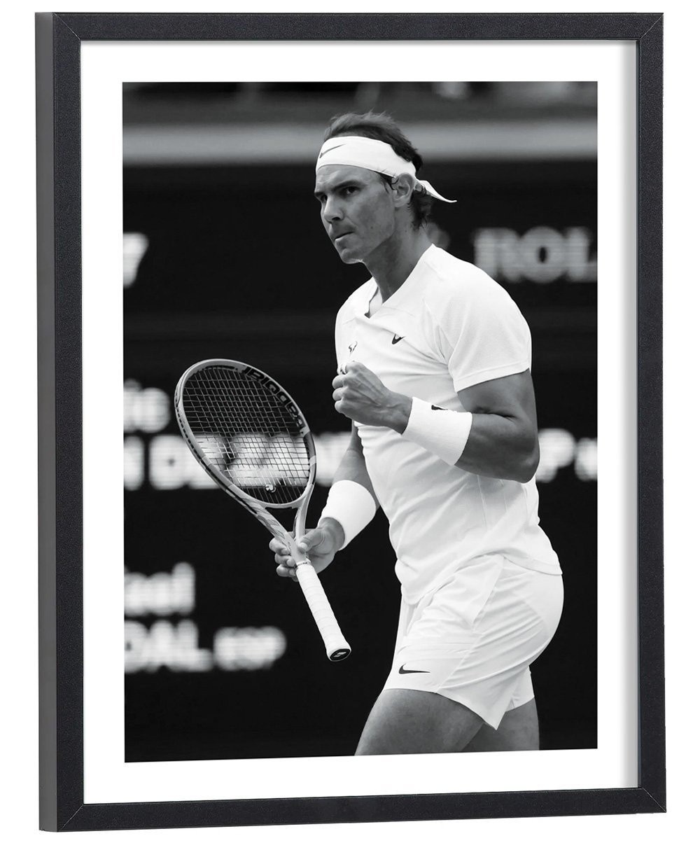 Tableau tennis noir et blanc du tennisman espagnol Rafael Nadal. Numéro 1 mondial pendant 209 semaines tout au long de sa carrière, Rafael Nadal compte 22 tournois du Grand Chelem remportés en simple.