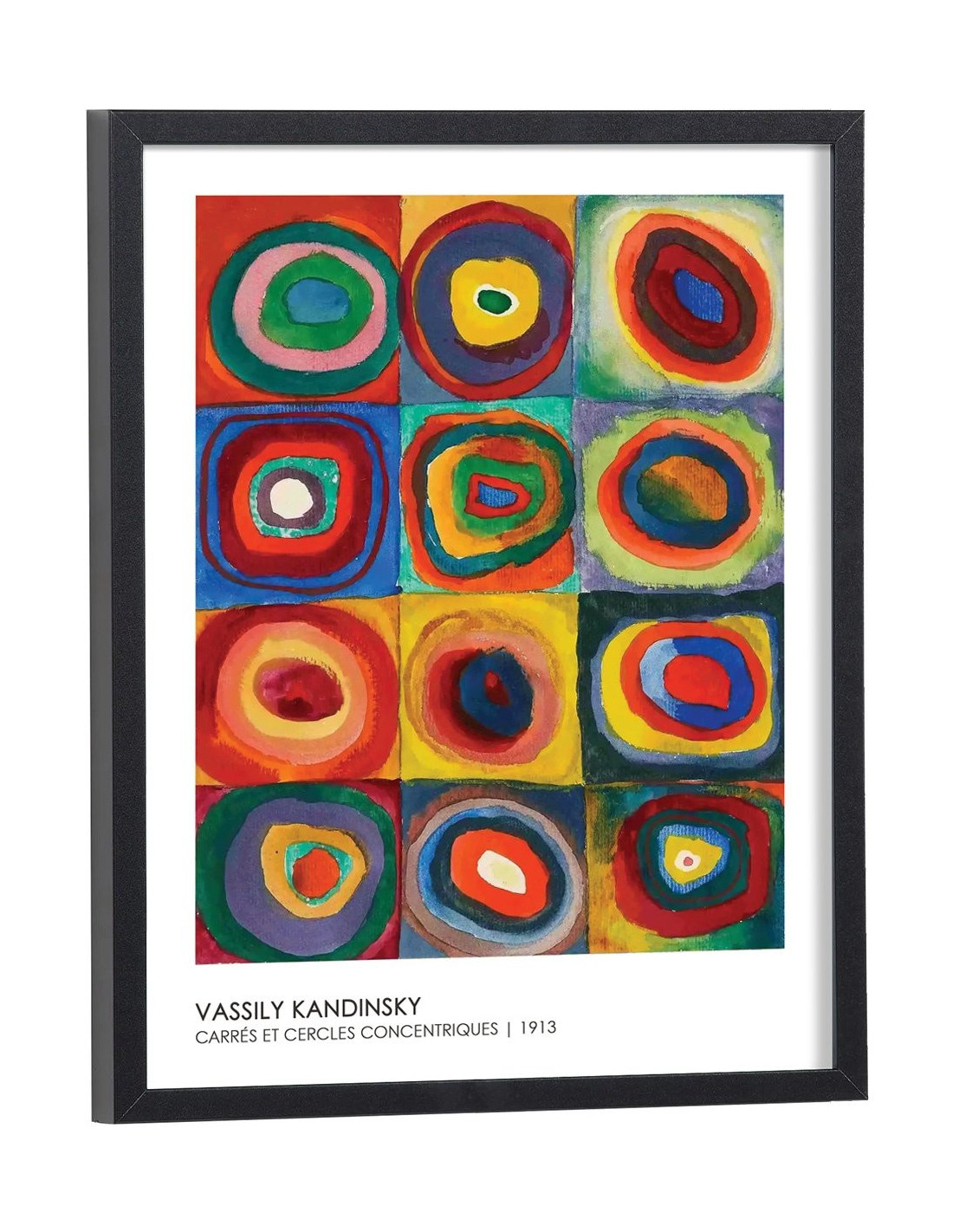 Reproduction du tableau de Vassily Kandinsky "Carrés et cercles concentriques". Cette œuvre est un tableau abstrait très coloré qui a été réalisé en 1913 par le peintre Kandinsky. On y voit des carrés et des cercles de différentes couleurs.