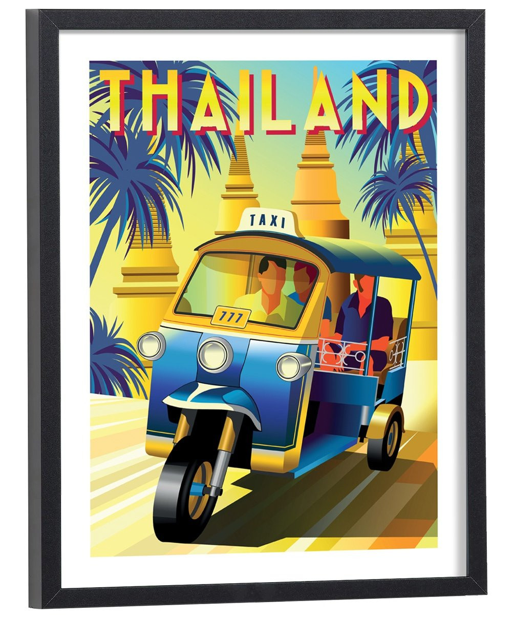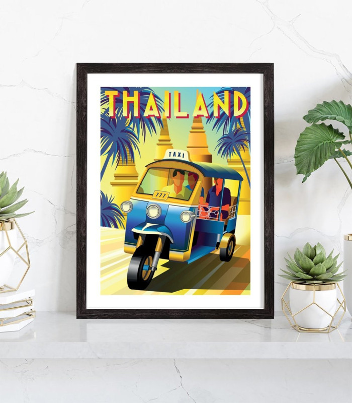 Évadez-vous avec cette magnifique affiche vintage de Thailande représentant un tuk-tuk coloré dans un paysage tropical. Parfaite pour créer une ambiance voyage dans votre salon ou chambre.