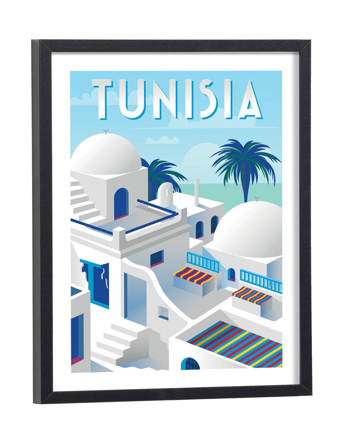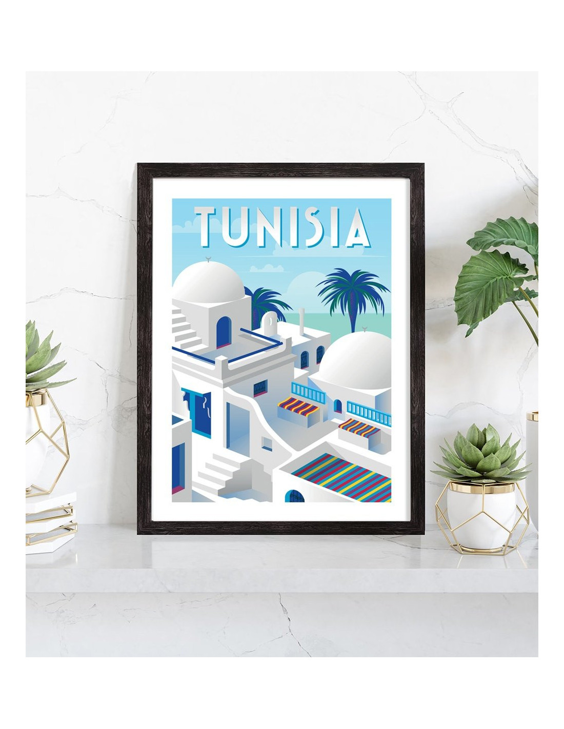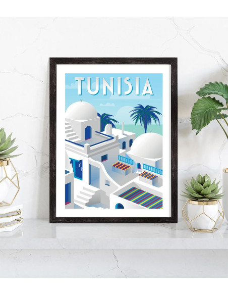 Affiche vintage de la Tunisie très colorée avec une vue typique sur le paysage tunisien. Cette affiche vintage de la Tunisie est vendue avec l'encadrement.