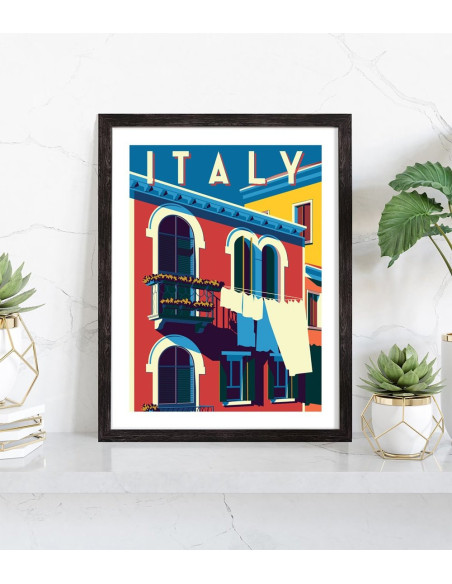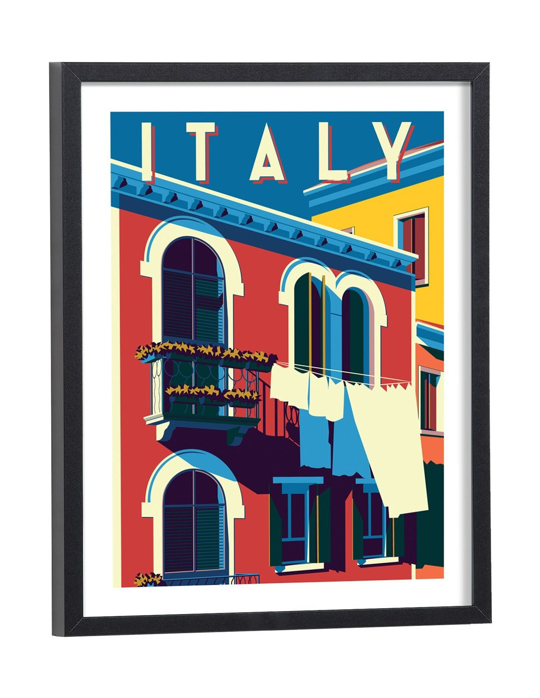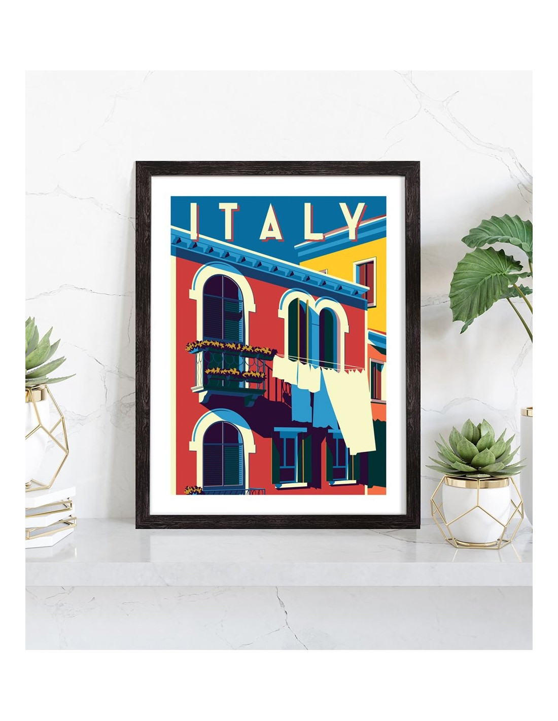 Affiche vintage de l'Italie avec une illustration colorée représentative d'une rue en Italie avec le linge accroché. Cette affiche vintage de l'Italie est vendue avec l'encadrement.