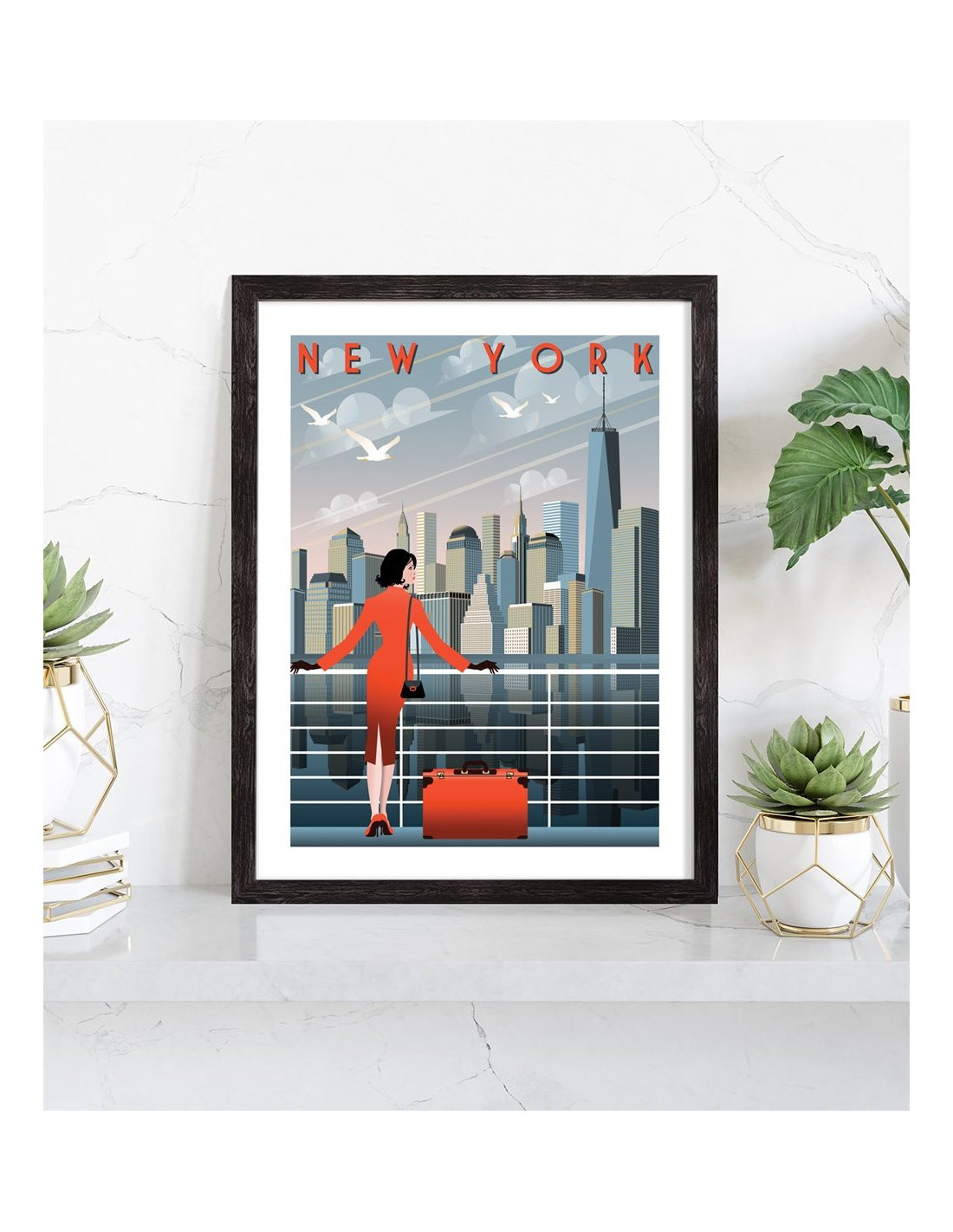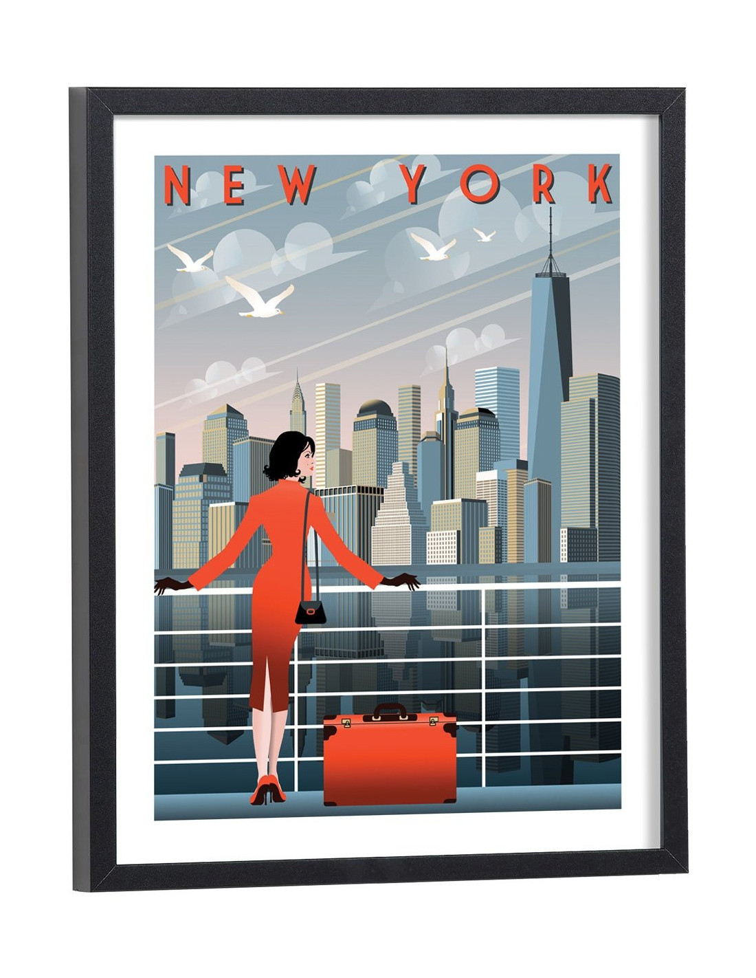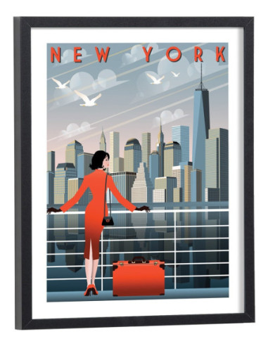 Affiche vintage de la ville de New York sur laquelle on peut voir une illustration représentant des buildings et une femme d'affaire sur un pont. Cette affiche vintage colorée de New York est vendue avec l'encadrement.