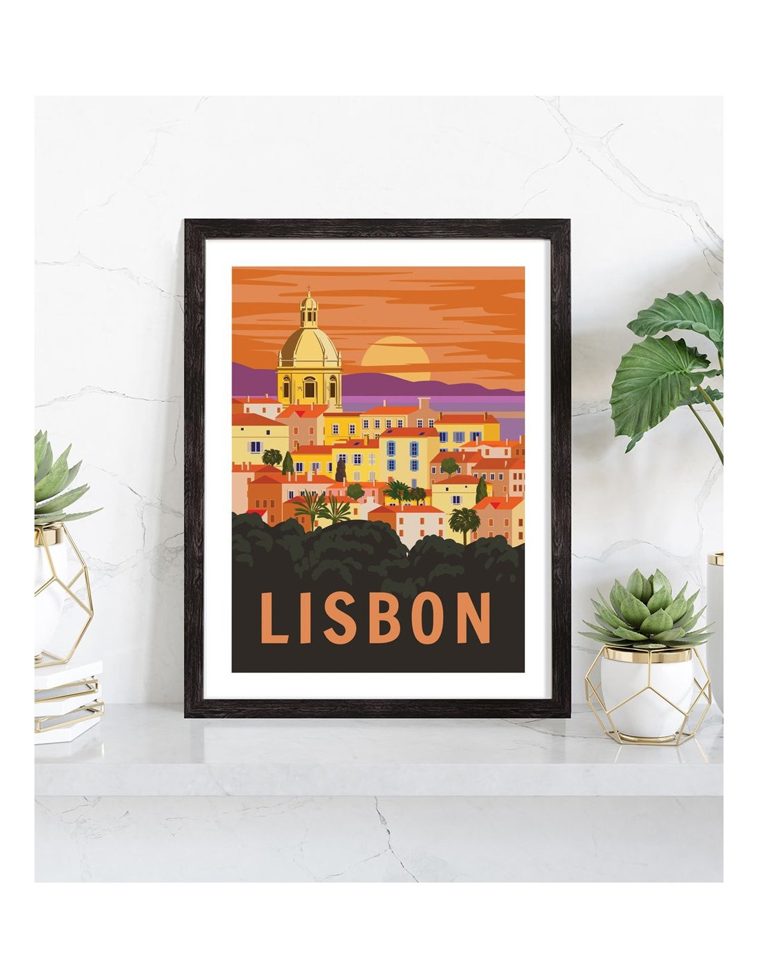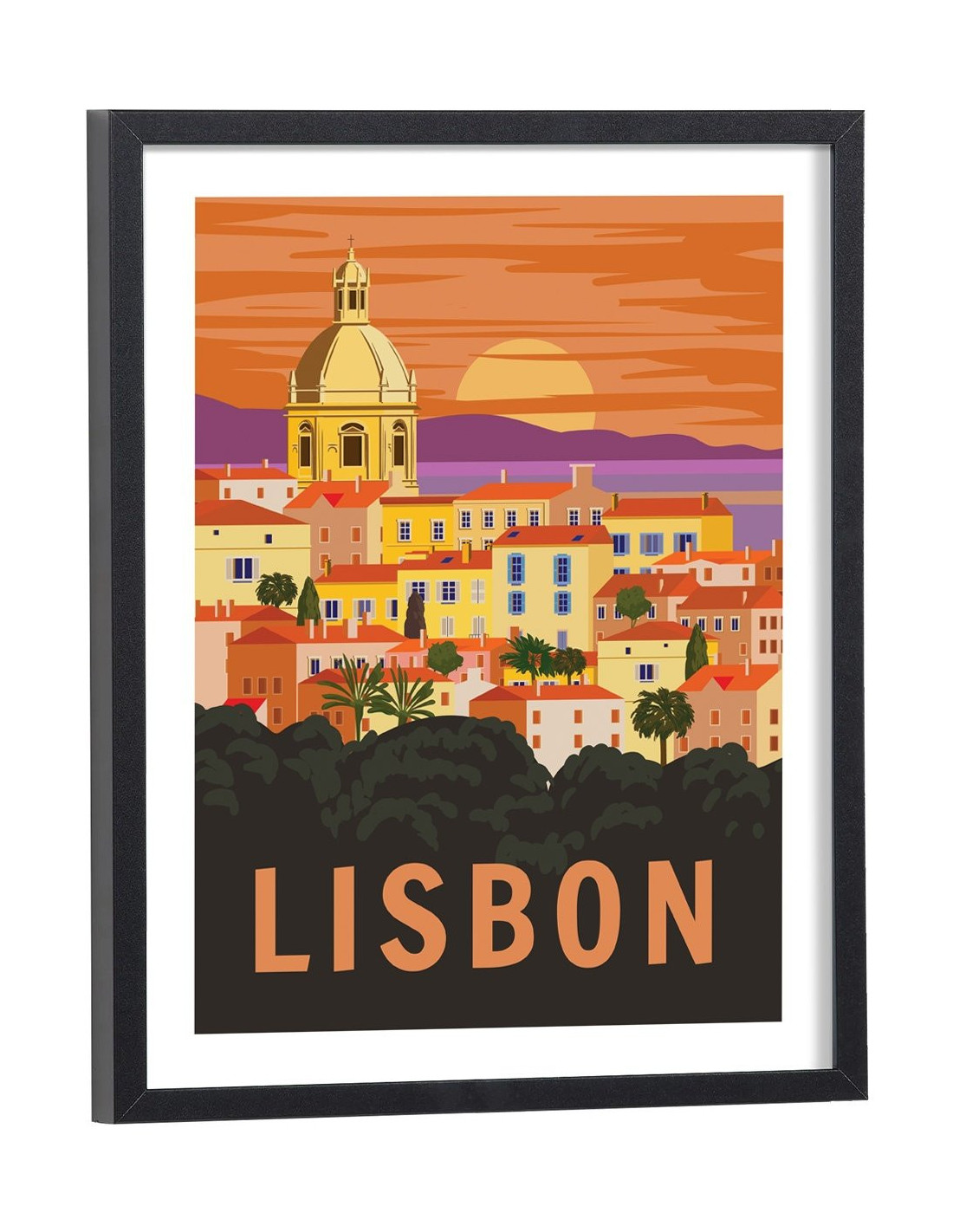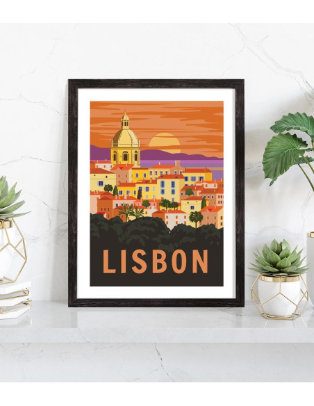 Affiche vintage de la ville de Lisbonne, capitale du Portugal. Cette affiche vintage et colorée de Lisbonne est vendue avec l'encadrement.