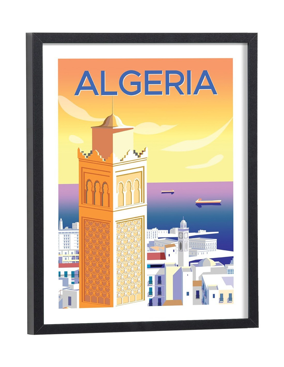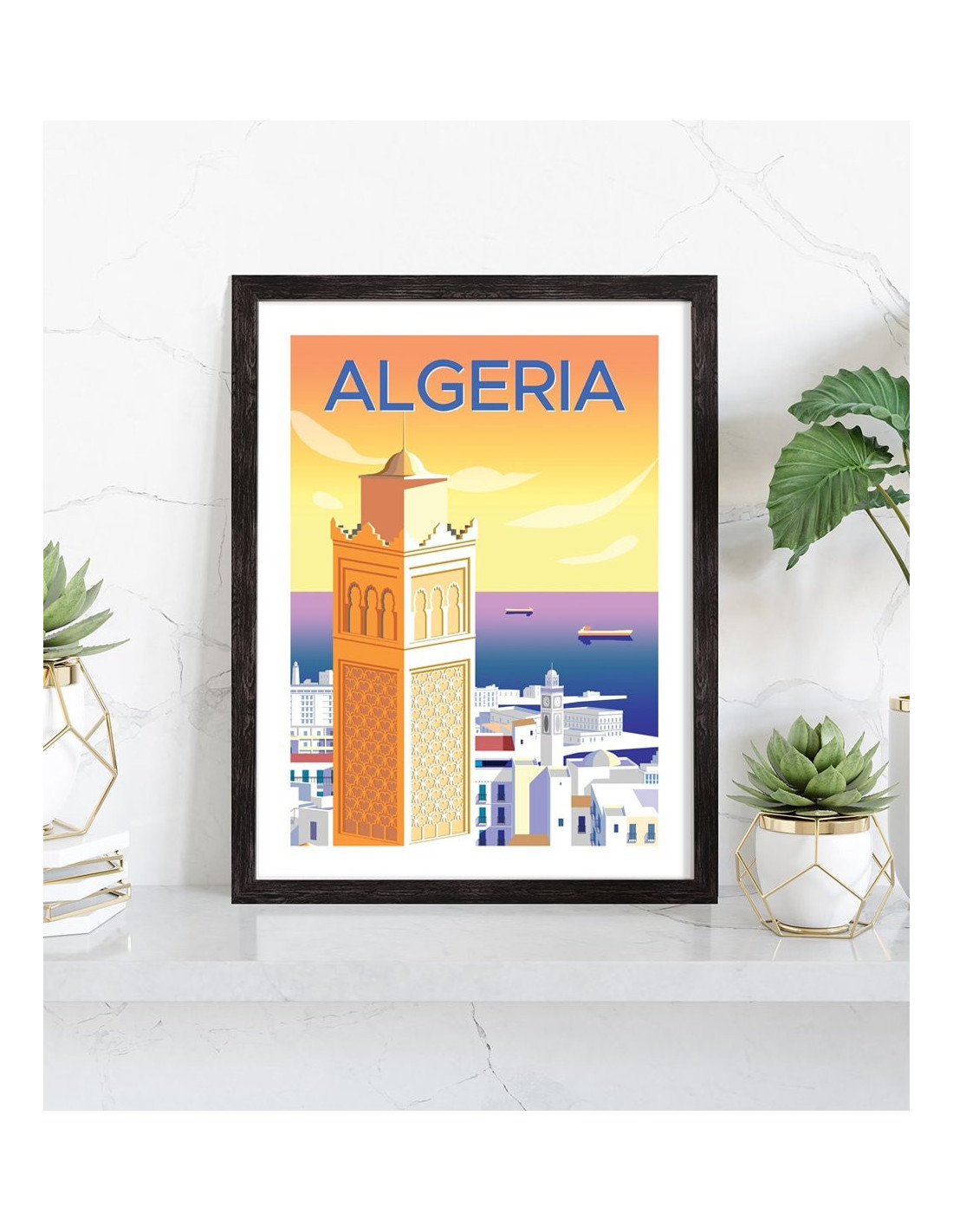 Affiche vintage de l'Algérie avec une magnifique vue du Pays. Cette affiche vintage et colorée de l'Algérie est vendue avec l'encadrement.