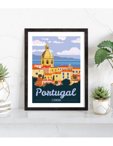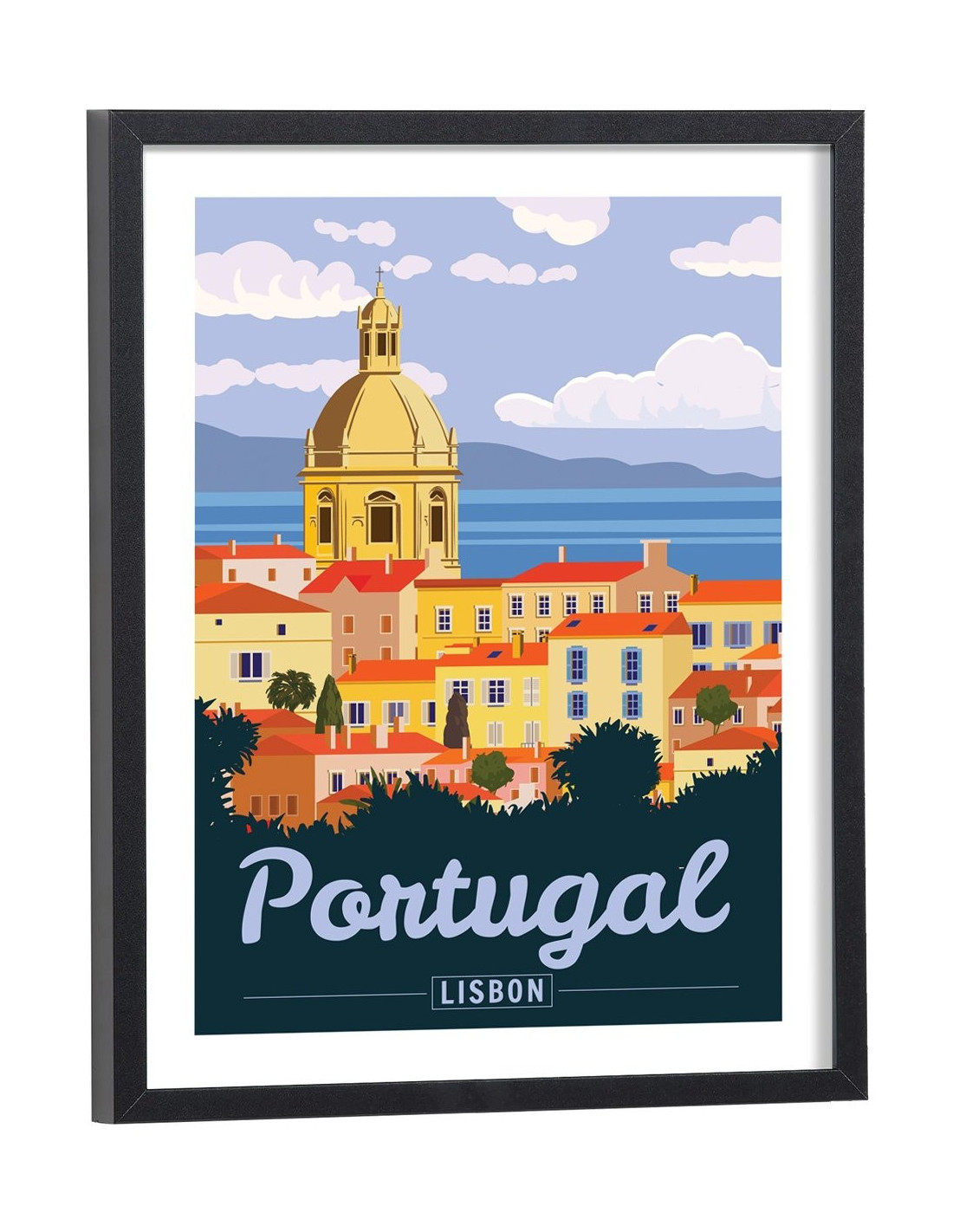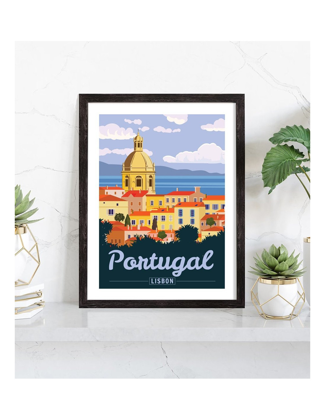 Affiche vintage du Portugal avec une vue sur la ville de Lisbonne. Cette affiche vintage du Portugal est vendue avec l'encadrement.